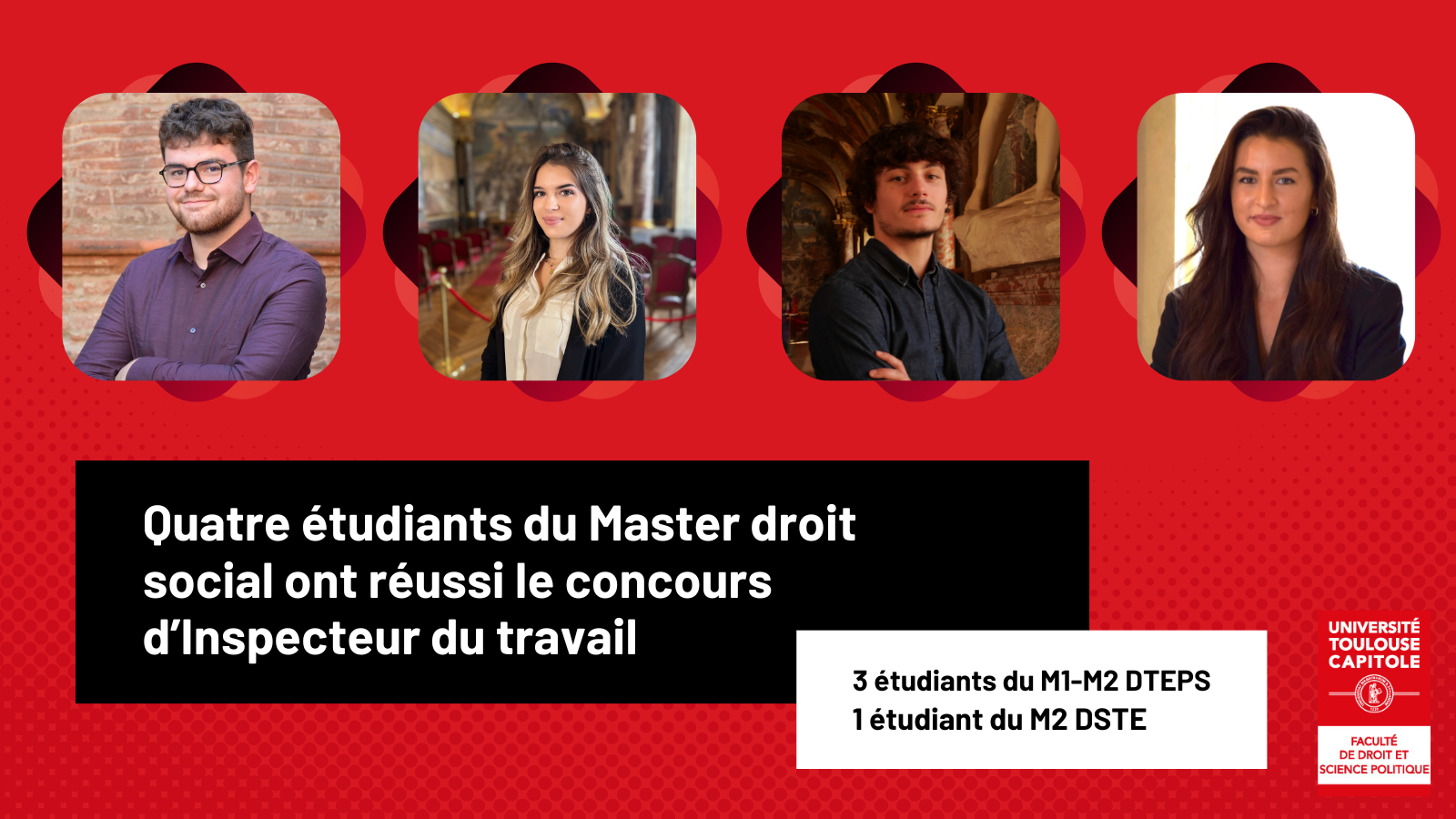 Quatre brillants étudiants toulousains du Master Droit social de la Faculté de droit ont réussi le concours d'inspecteur du travail en 2023.