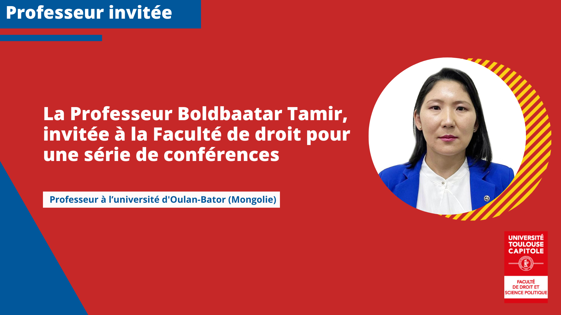 La semaine du 4 septembre, Madame Boldbaatar Tamir, professeur spécialisée en droit international privé et en droits de l'Homme, sera invitée à la Faculté de Droit pour dispenser une série de conférences.