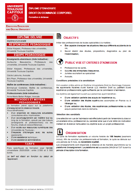 auprès du service Executive Education and Digital University (EEDU) de l’Université Toulouse Capitole : Kerwan Gholami, Manufacture des Tabacs, 21 allée de Brienne, Bâtiment Q, 1er étage