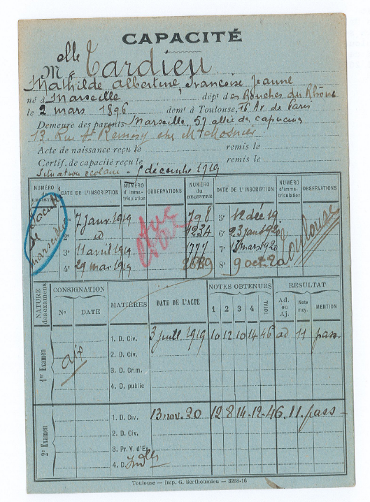 La première femme capacitaire, Capa n° 692, est Mathilde, Albertine, Françoise, Jeanne Tardieu, décembre 1920 pour la remise de la Capa et novembre 1919 pour les épreuves. Née à Marseille et venue de la Faculté d’Aix, elle y a passé la première partie des épreuves de la Capa avant de rejoindre Toulouse.