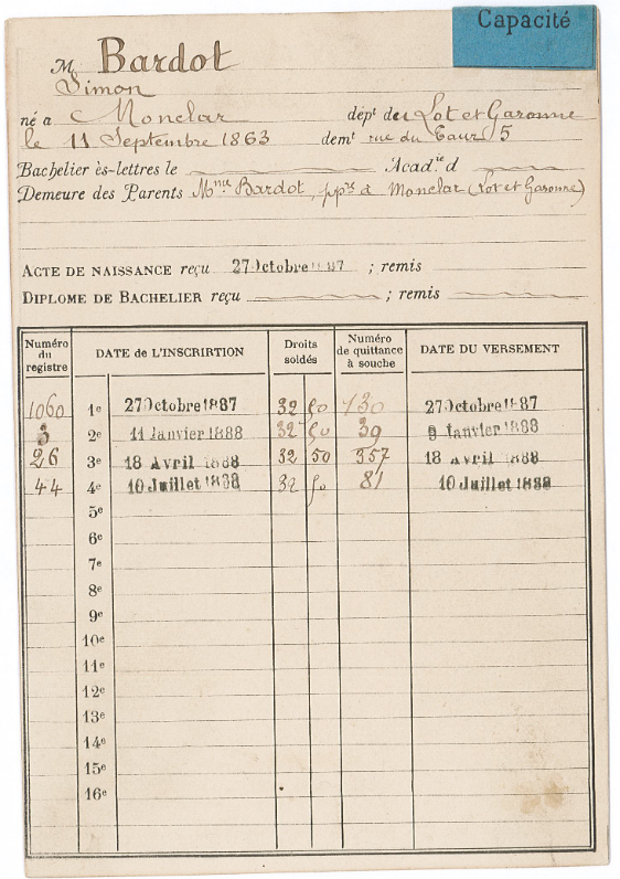 La première inscription portée sur le registre est celle de Simon Bardot (16 juillet 1888), originaire de Monclar (Lot-et-Garonne ; arr. Villeneuve-sur-Lot), fiche Archives UT Capitole, 5Z3 (70% de la taille OR pour la numérisation infra)
