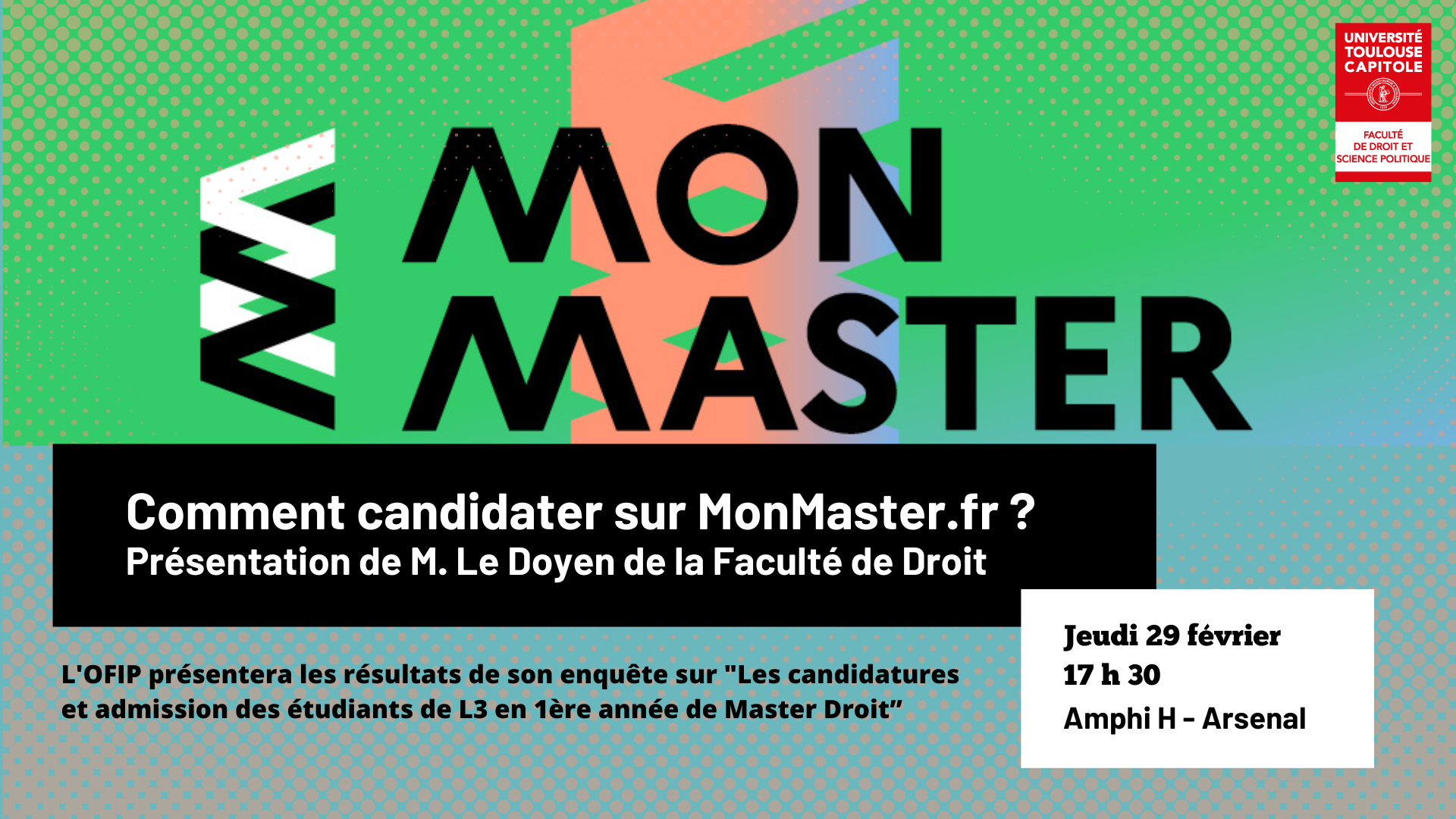 La plateforme Mon Master est ouverte aux candidatures depuis ce lundi 26 février. A ce titre, la Faculté de Droit et Science Politique organise le 29 mars une présentation animée par M. le Doyen de la Faculté de droit, Matthieu Poumarède pour expliquer aux étudiants en Licence droit comment candidater en Master de droit sur cette plateforme.