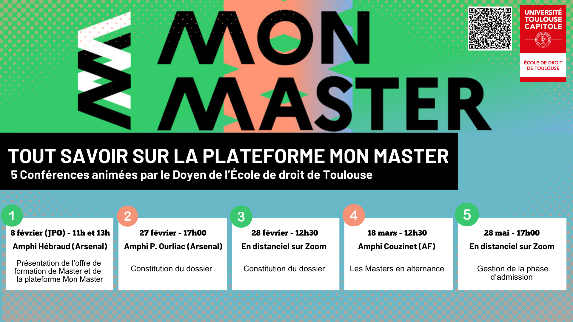 Vous êtes en Licence 3 et souhaitez candidater en Master ? Vous vous interrogez sur la plateforme #MonMaster, l’offre de formation de l’École de droit de Toulouse et la meilleure façon de remplir votre dossier de candidature ? Ne manquez pas les conférences, en présentiel et en distanciel, animées par le Doyen !