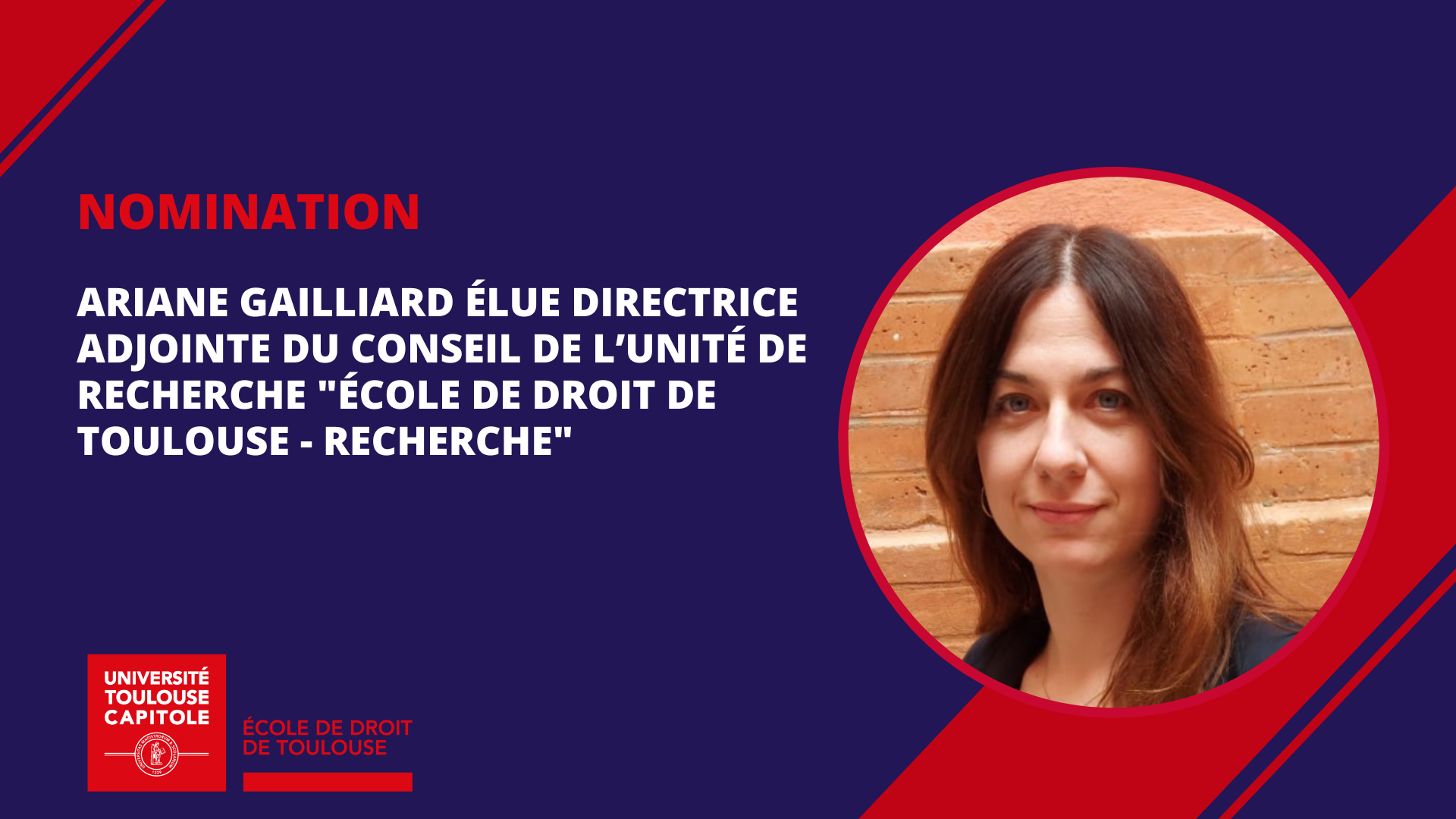Madame Ariane Gailliard a été élue Directrice adjointe du Conseil de l’Unité de recherche École de Droit de Toulouse - Recherche (EDT-R), elle a officiellement pris ses fonctions le 16 septembre 2025.