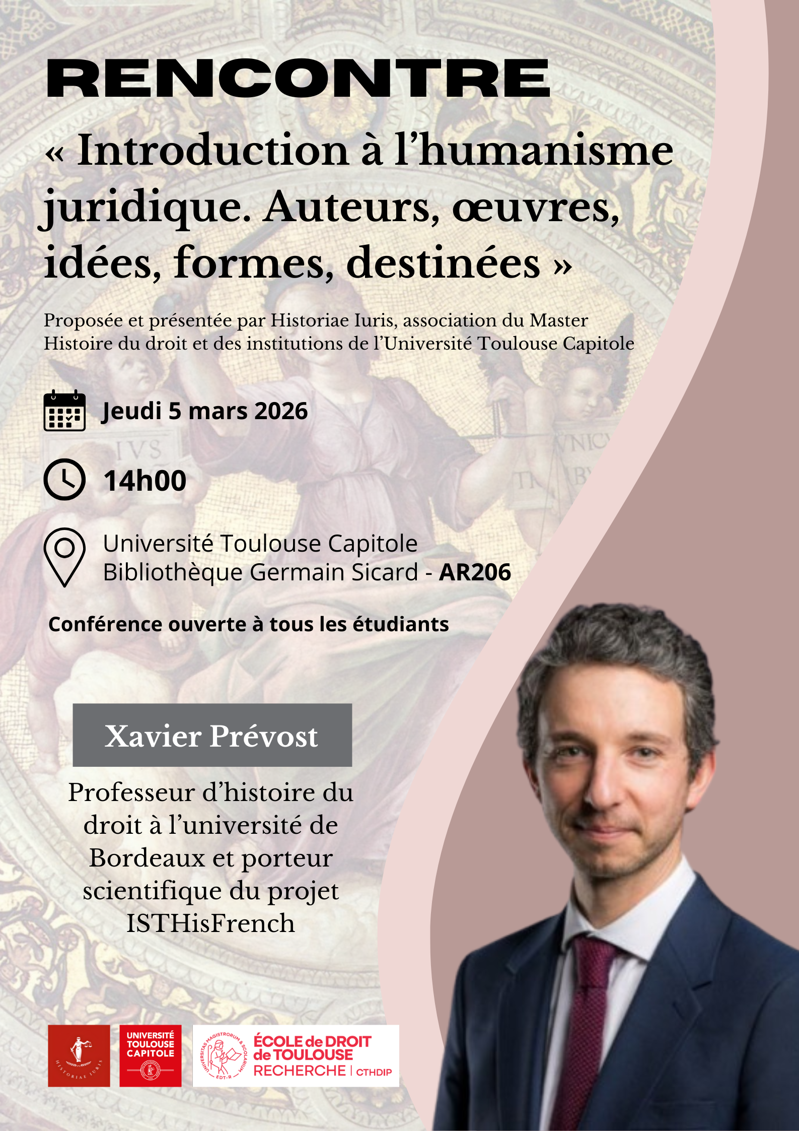 "Introduction à l'humanisme juridique. Auteurs, oeuvres, idées, formes, destinées", conférence de Xavier Prévost (Université de Bordeaux) organisée par Historiae Iuris, avec le soutien du CTHDIP