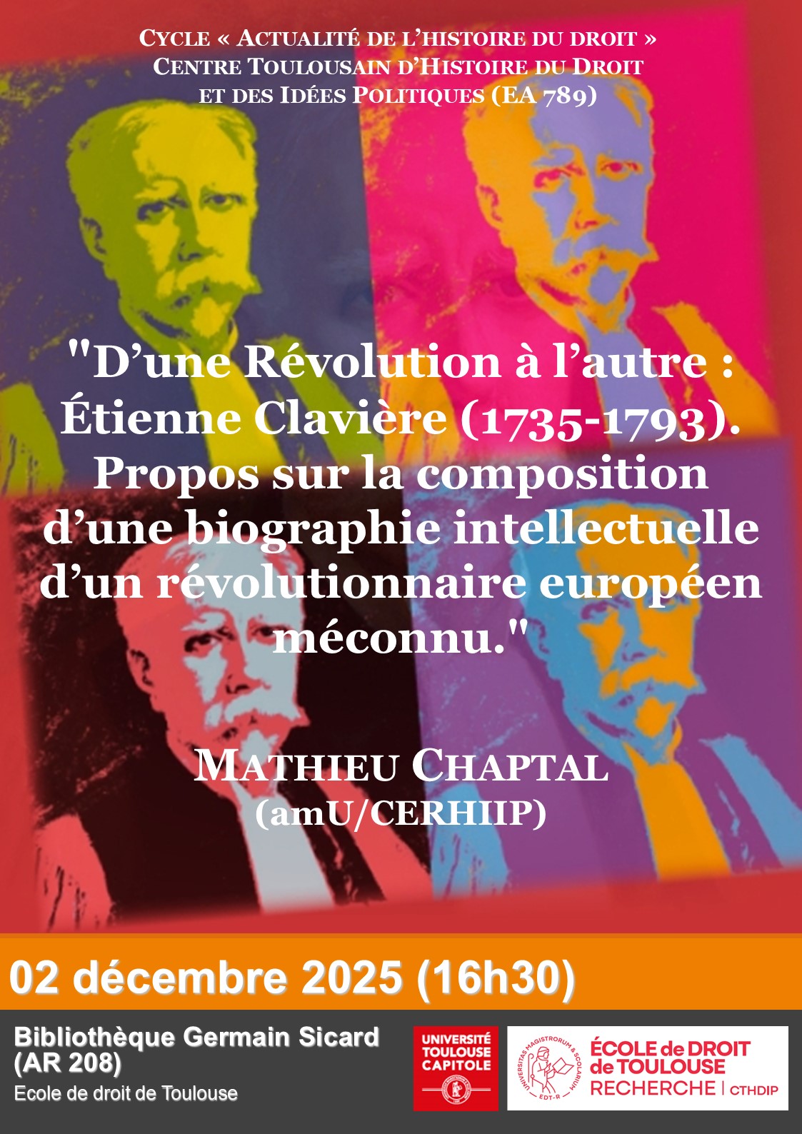 "D’une Révolution à l’autre : Étienne Clavière (1735-1793). Propos sur la composition d’une biographie intellectuelle d’un révolutionnaire européen méconnu.", conférence de Mathieu Chaptal (amU/CERHIIP) organisée par Jérôme Henning (CTHDIP)