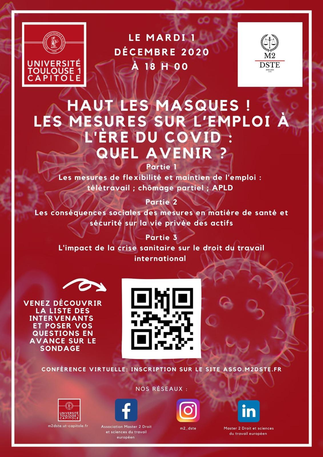 L’association du Master 2 Droit et Sciences du Travail Européen (DSTE) vous invite à sa conférence participative s’intitulant « Haut les masques ! Les mesures sur l’emploi à l’ère du COVID : quel avenir ? »