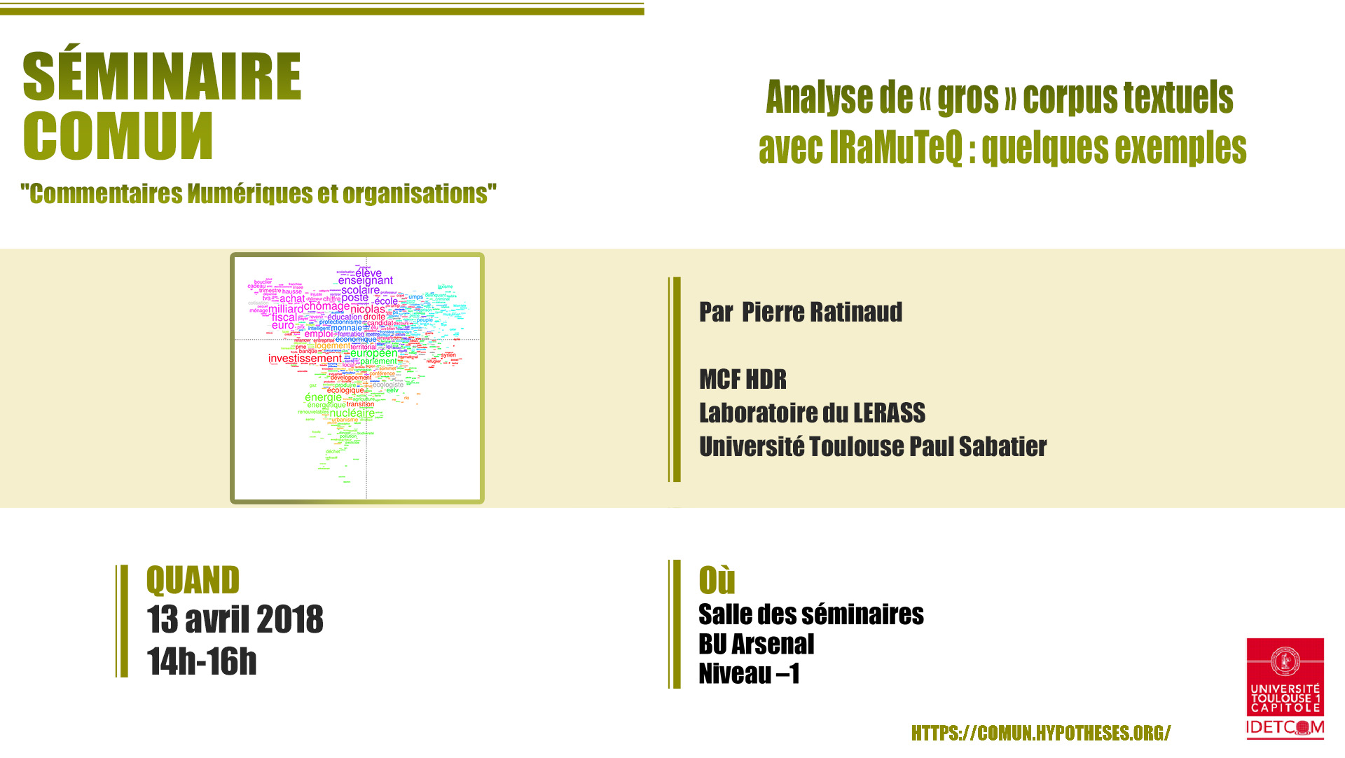 "Analyse de "gros" corpus textuels avec IRaMuTeQ: quelques exemples", conférence organisée par l'IDETCOM