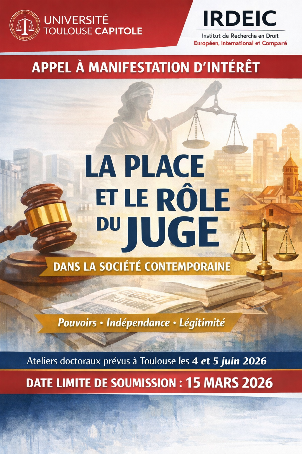Au vu de ces éléments et dans ce contexte, les doctorants, quelle que soit la discipline de rattachement de leur sujet de thèse, peuvent adresser une proposition de communication autour de la place et du rôle du juge dans la société contemporaine (le document est de 5000 signes espaces compris maximum) et un Curriculum vitae à joel.andriantsimbazovina@ut-capitole.fr et marc.segonds@ut-capitole.fr).