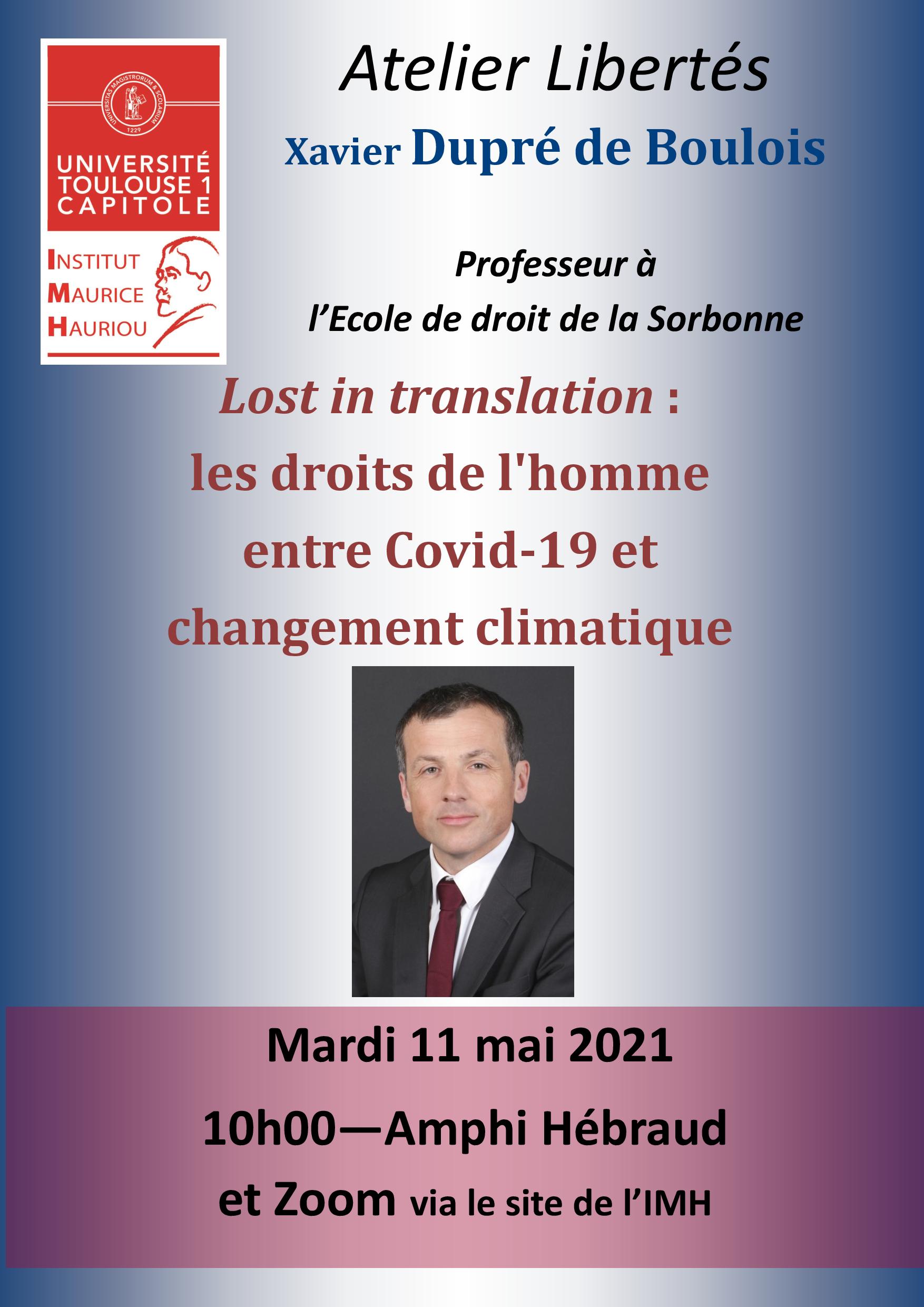 "Atelier Libertés" Lost in translation : les droits de l'homme entre Covid-19 et changement climatique avec Le Pr Xavier Dupré de Boulois à l’Ecole de droit de la Sorbonne Conférence organisée par l'IMH