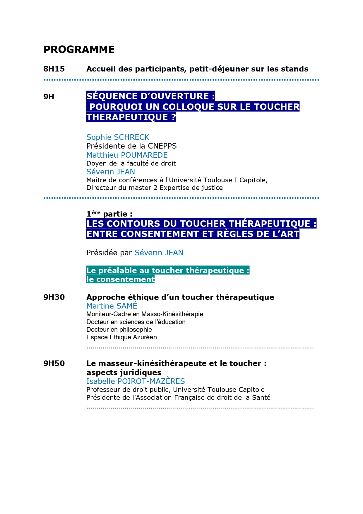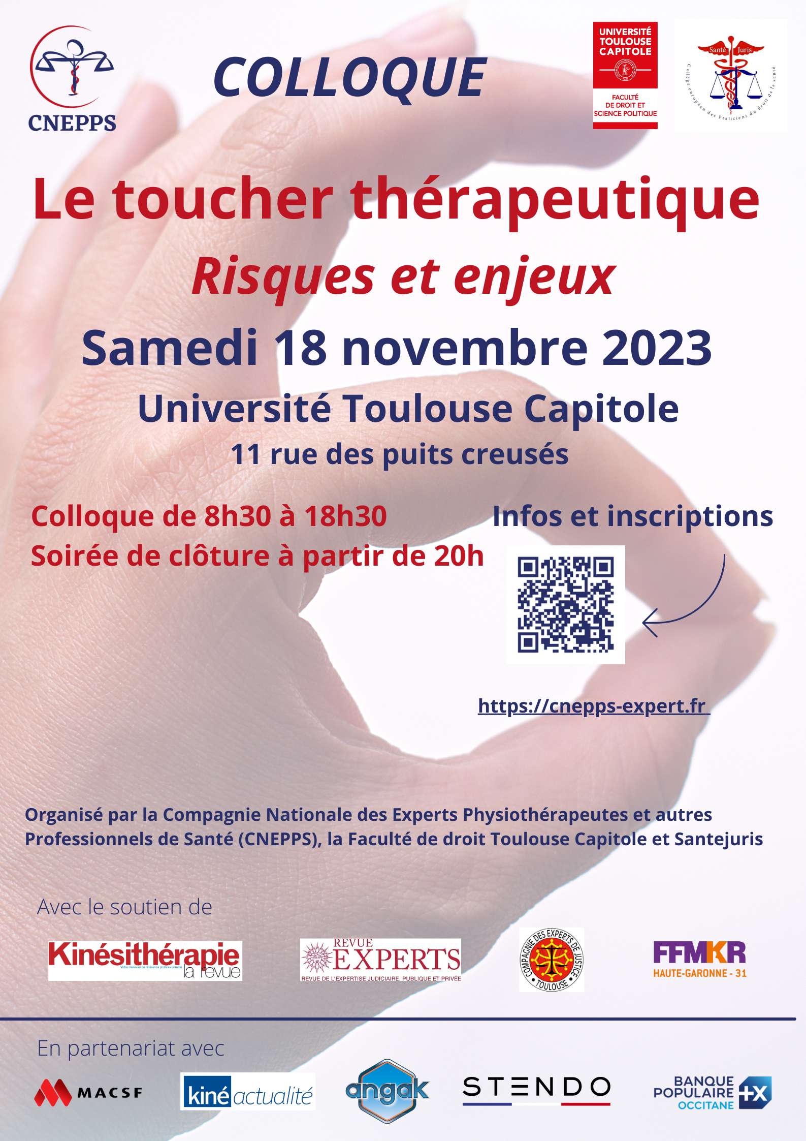 La Faculté de droit de Toulouse organise, en collaboration avec la CNEPPS et SantéJuris, un colloque sur « Le Toucher Thérapeutique, risques et enjeux » le samedi 18 novembre à l'Université Toulouse Capitole.