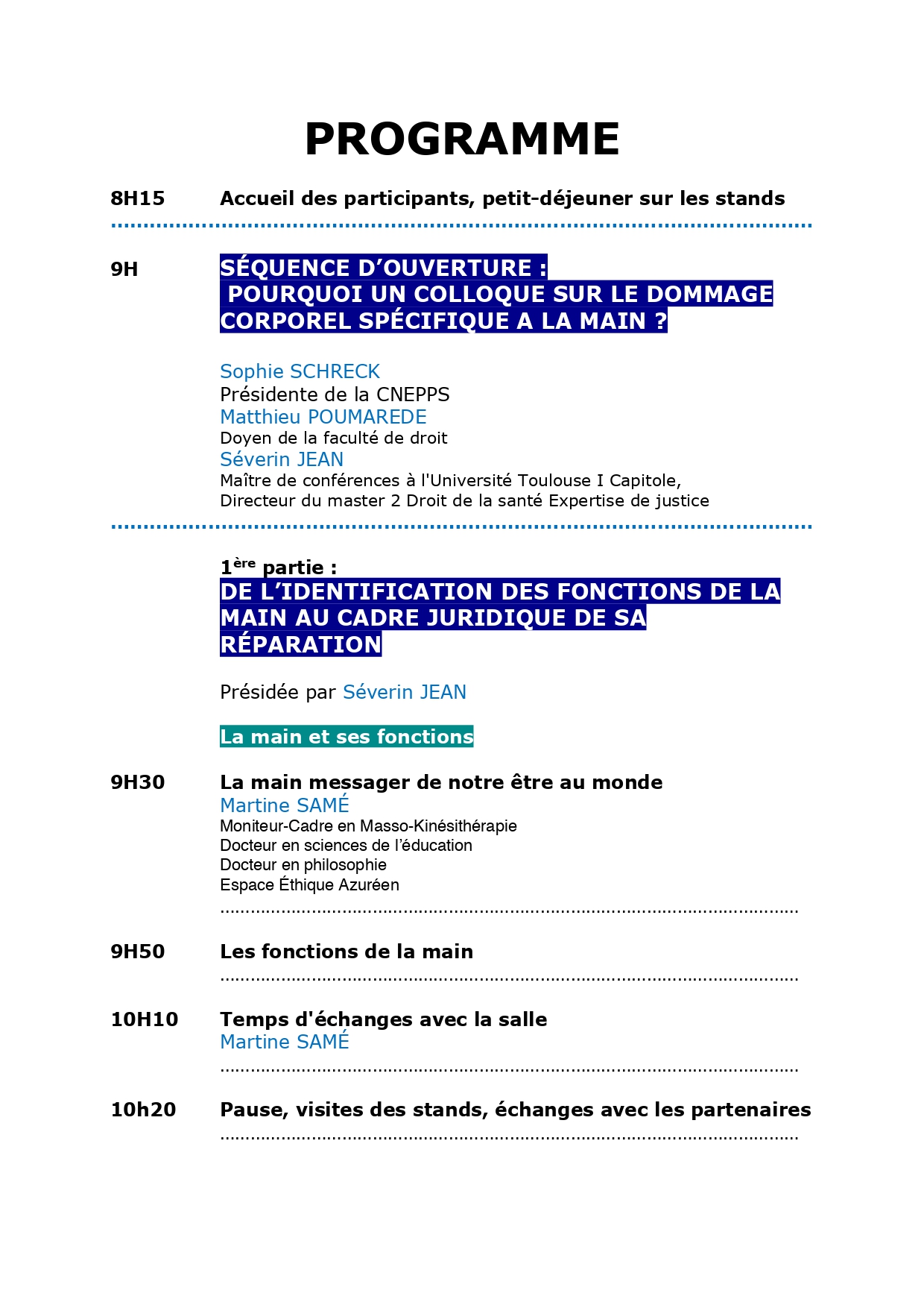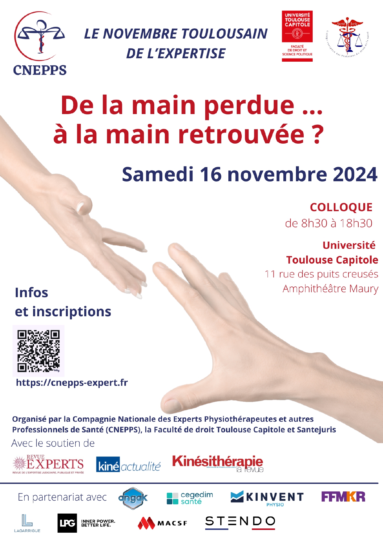 La Faculté de droit de Toulouse organise, en collaboration avec la Compagnie Nationale des Experts Physiothérapeutes et autres Professionnels de Santé (CNEPPS) et SantéJuris, un colloque sur le thème : "De la main perdue à la main retrouvée ?", le samedi 16 novembre à l'Université Toulouse Capitole.