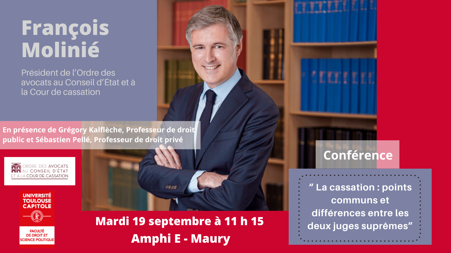 La Faculté de droit de Toulouse est honorée de la venue très attendue de M. François Molinié, Président de l’Ordre des avocats au Conseil d’État et à la Cour de cassation, pour la signature d'une convention de partenariat entre la Faculté de droit de l’Université Toulouse Capitole et l’Ordre des avocats au Conseil d’État et à la Cour de cassation. À cette occasion, M. Molinié animera une conférence exceptionnelle sur le thème : "La cassation : points communs et différences entre les deux juges suprêmes". (Les deux événements sont ouverts à l'ensemble de la communauté universitaire, sur inscription).