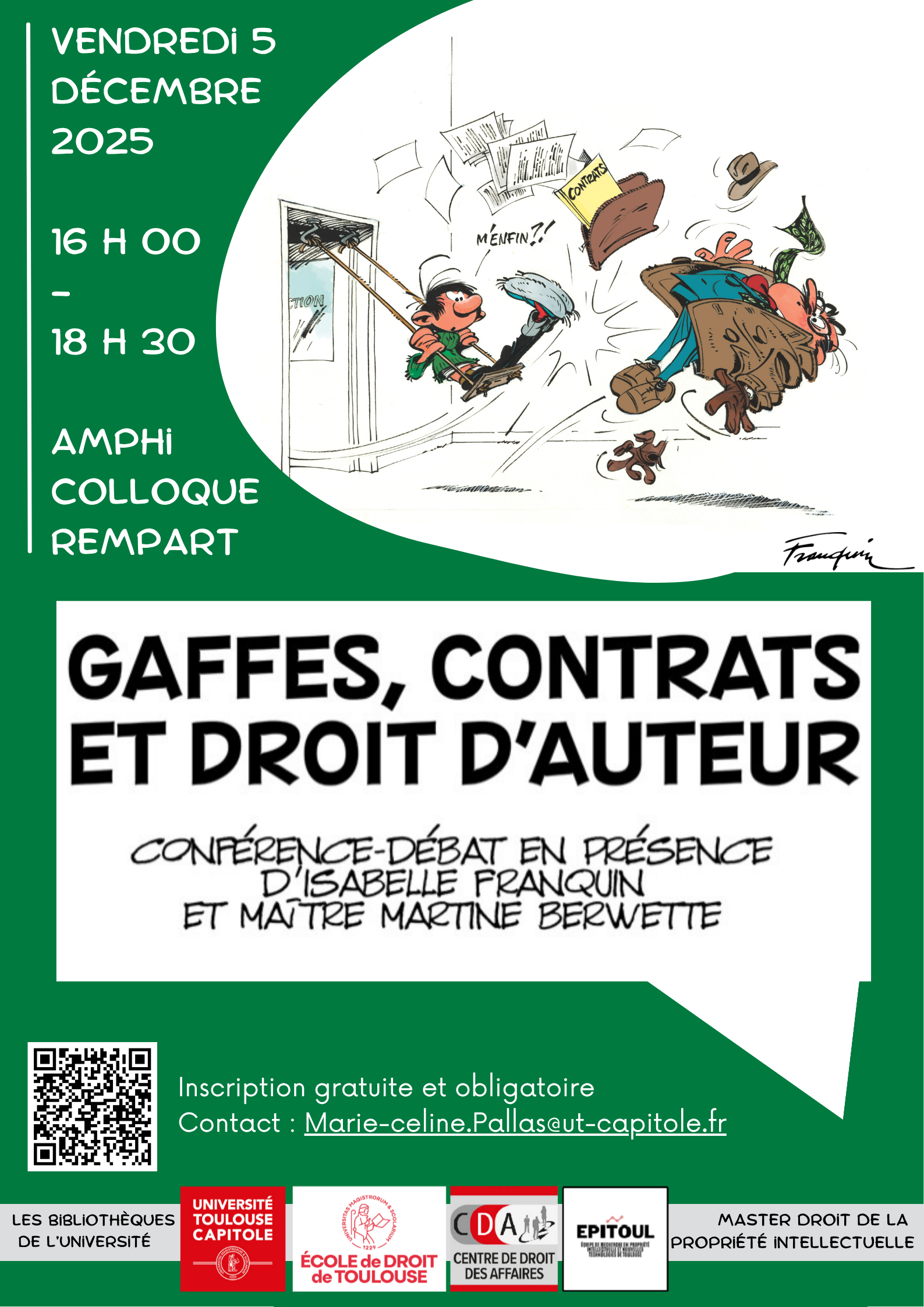Dans le cadre des conférences "droit d'auteur et littérature" organisée par EPITOUL, le Master 2 Propriété intellectuelle et les bibliothèques de l'université, nous avons l'honneur d'accueillir Isabelle Franquin qui vient présenter l’héritage artistique de son père André Franquin, en compagnie de l'avocate Maître Martine Berwette.