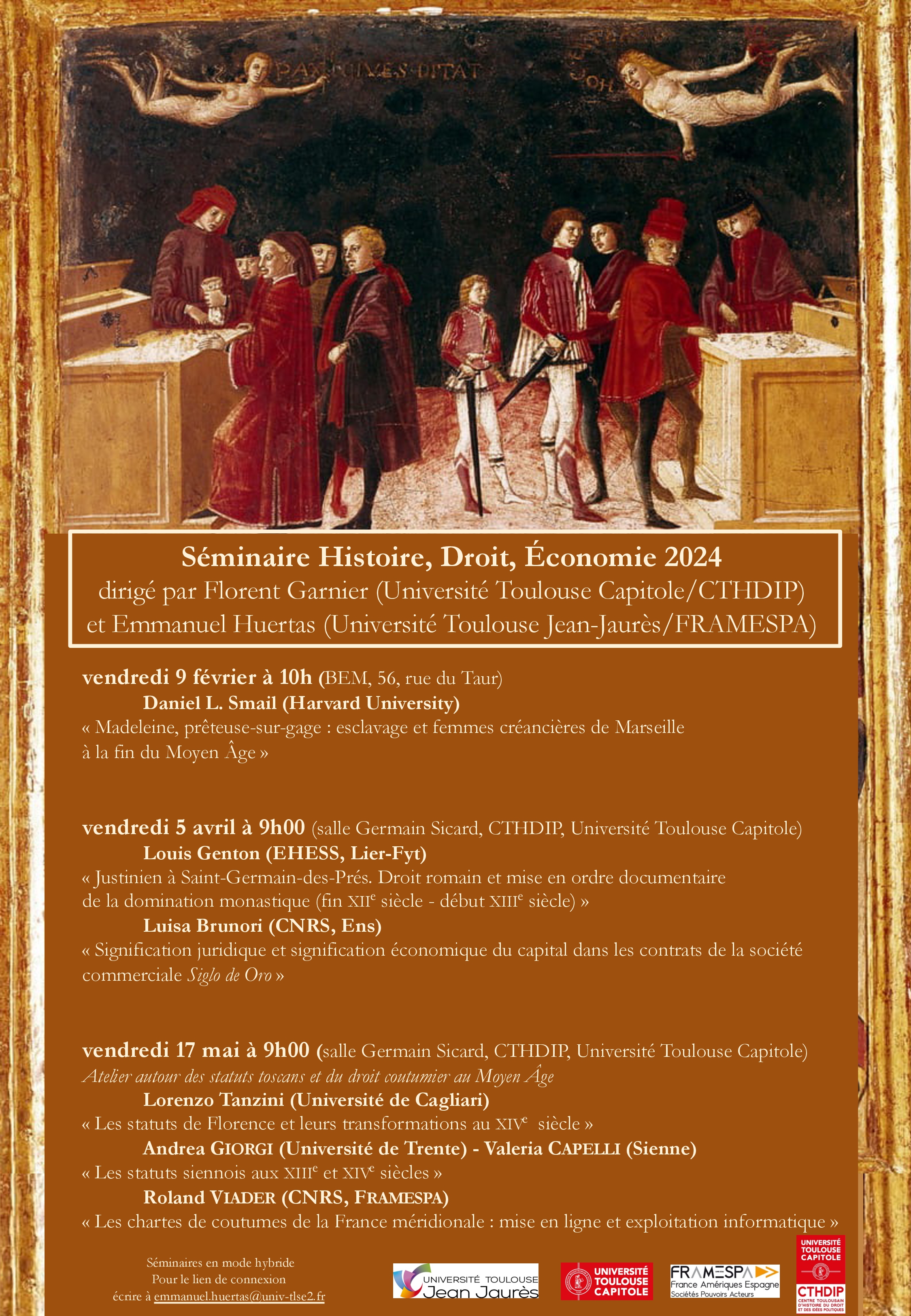 Conférences données par Luisa Brunori (CNRS, ENS) et par Louis GENTON (EHESS, LIER-FYT) dans le cadre du séminaire "Histoire Droit Economie" dirigé par Florent Garnier (Université Toulouse Capitole/CTHDIP) et Emmanuel Huertas (Université Toulouse Jean-Jaurès/FRAMESPA)