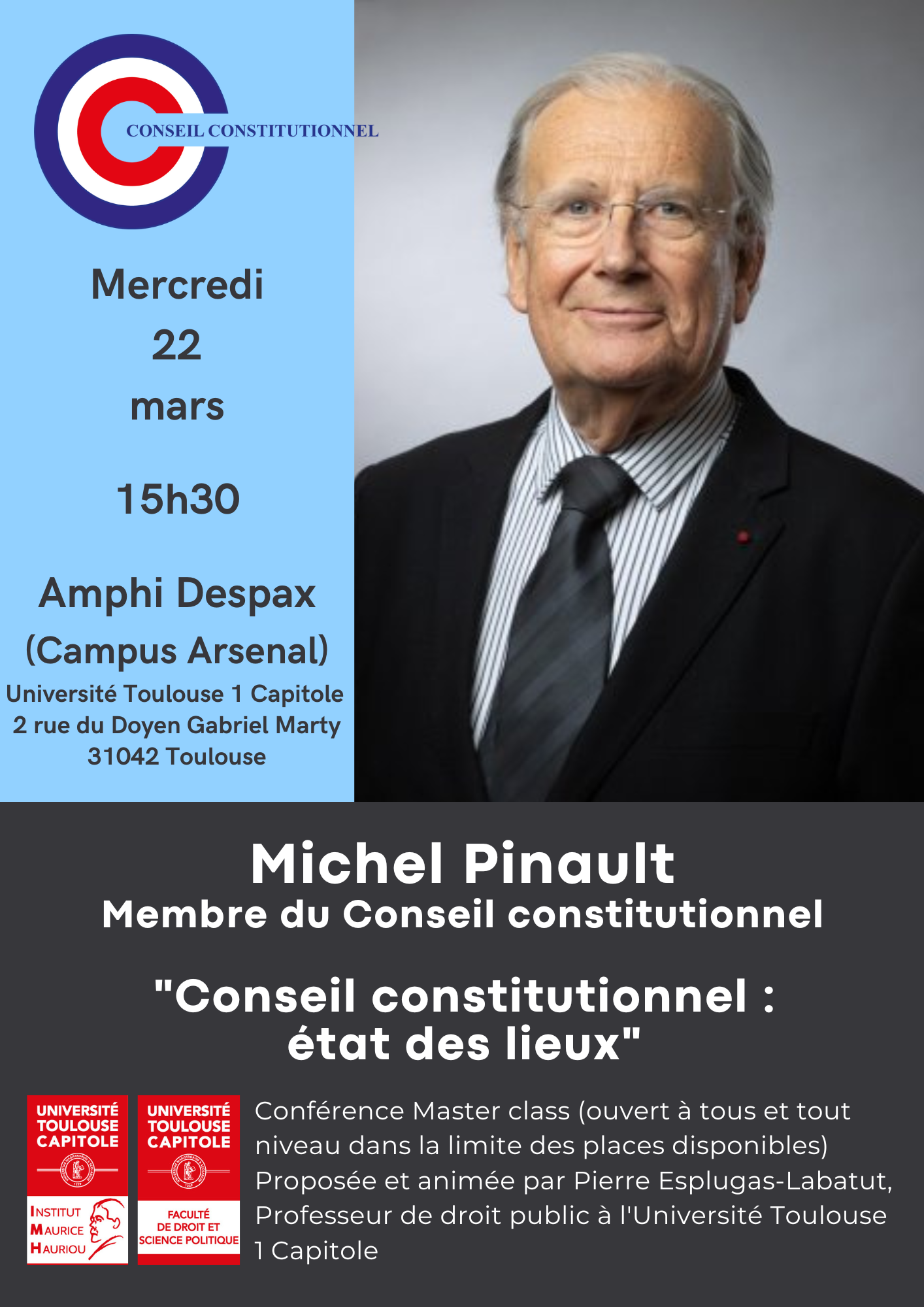 Michel Pinaul, membre du Conseil constitutionnel, est invité par le Professeur Pierre Esplugas-Labatut pour une masterclass, dans le cadre de son cours de Droit constitutionnel de première année de Licence en Droit.