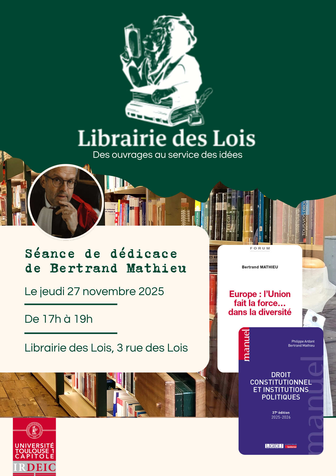 Séance de dédicace autour de l'ouvrage « Europe : l’Union fait la force … dans la diversité » de Bertrand Mathieu, organisée par l'IRDEIC à la Librairie des Lois