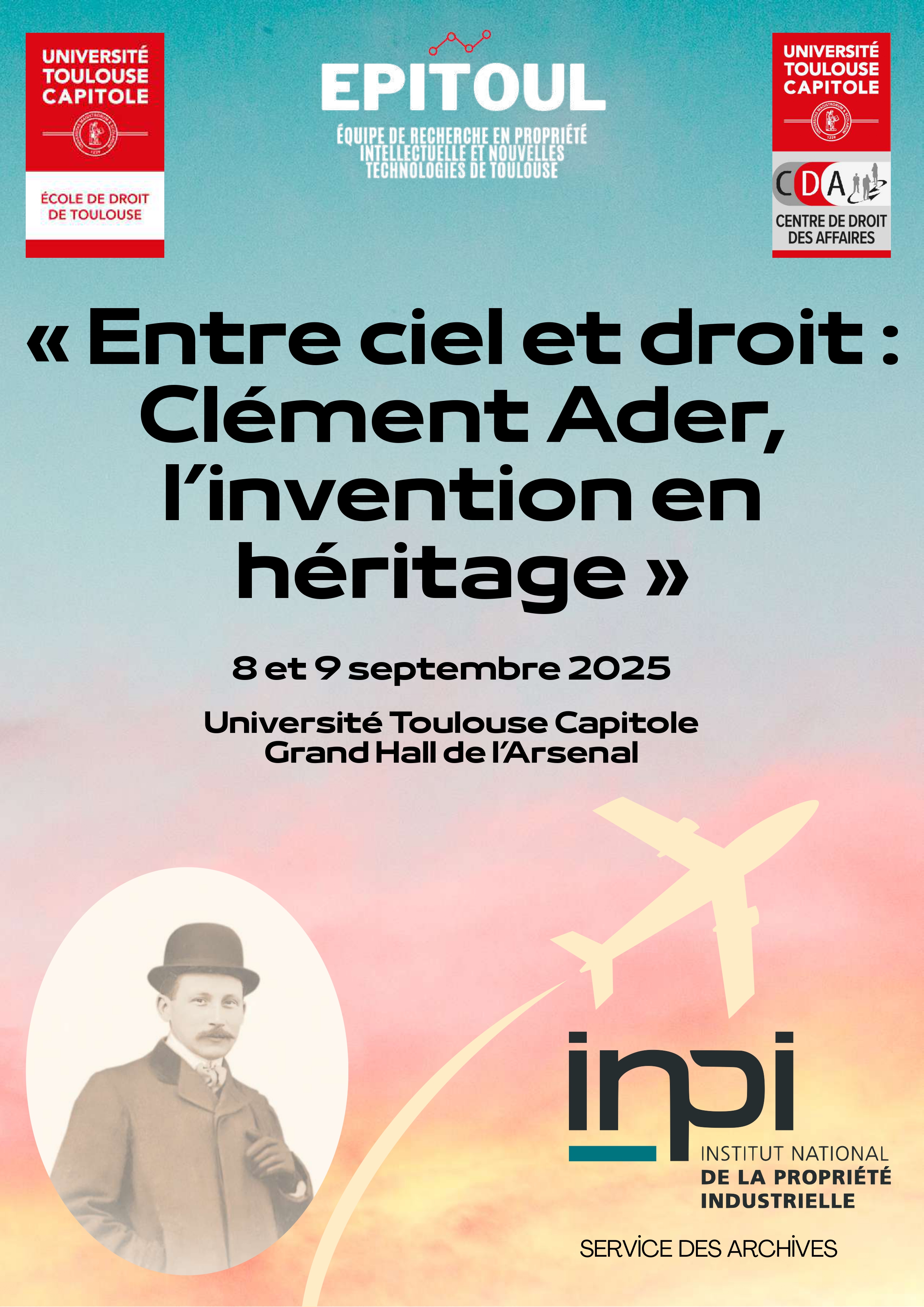À l’occasion de la conférence d’Epitoul, équipe de recherche du Centre de droit des affaires et de la rentrée du Master Propriété intellectuelle dirigés par le Professeur Alexandra Mendoza à l’Université Toulouse Capitole, conférence intitulée « Entre ciel et droit : comment protéger le design des avions? » une exposition inédite met en lumière le travail de Clément Ader (né le 2 avril 1841 à Muret et mort le 3 mai 1925 à Toulouse), figure emblématique de l’histoire de l’aviation et pionnier de l’invention protégée.