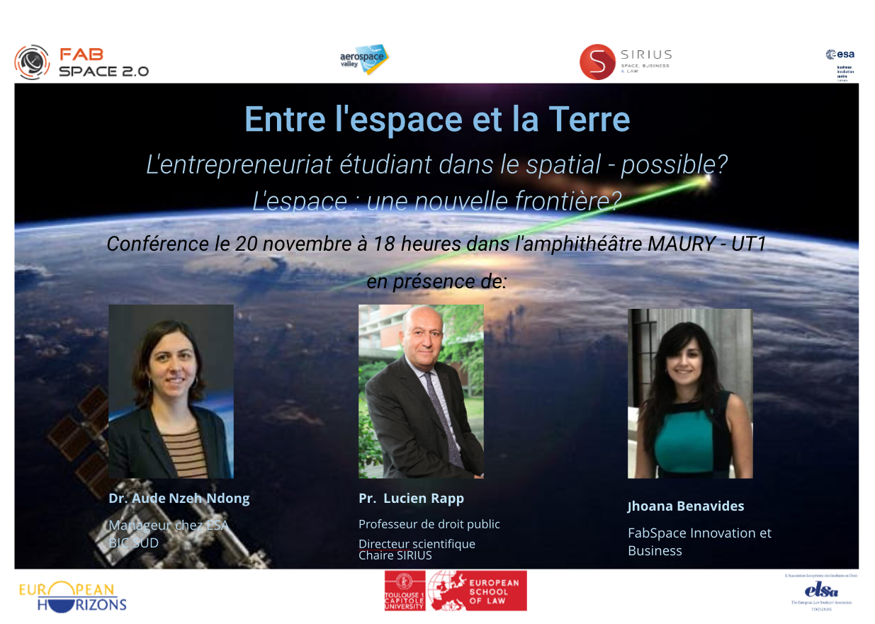 Les associations ELSA et European Horizons vous proposent, le mardi 20 novembre 2018 à 18 heures à l'amphithéâtre Maury, une conférence autour du secteur spatial, "Entre l'espace et la Terre", animée par le Professeur Lucien Rapp, directeur scientifique de la Chaire Sirius et mesdames Jhoana Benavides et Aude Nzeh Ndong, qui travaillent respectivement à l'AeroSpace Valley et à la European Space Agency.