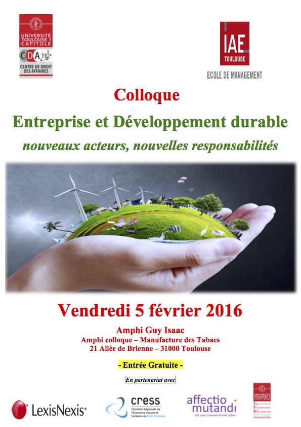 "Entreprise et Développement durable - Nouveaux acteurs - Nouvelles responsabilités " Colloque organisé par le Centre Droit des Affaires (CDA)