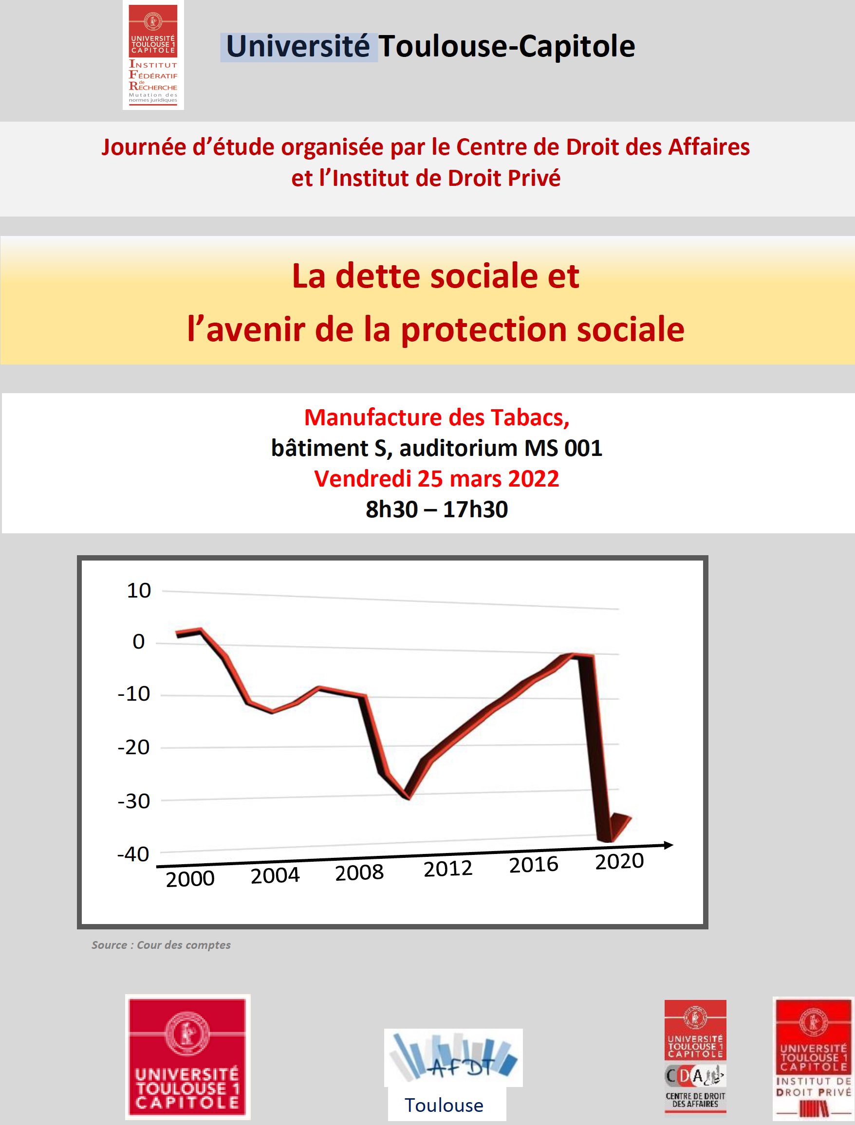 Dans ce contexte, l’objectif de cette journée d’étude est de permettre une confrontation des analyses menées à la fois par des spécialistes des comptes publics, des juristes, des économistes et des acteurs du secteur, afin de dresser un état des lieux de l’étendue de la dette, de la manière dont elle est gérée, de son évolution et de comprendre l’impact qu’elle peut avoir sur la prise en charge des différents risques : maladie, vieillesse, autonomie, chômage.