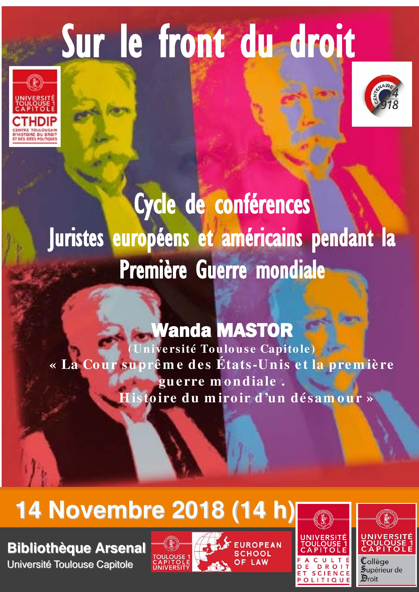 A l’aide de projection d’images et diffusion de bandes son, cette conférence tentera de raconter cette histoire à travers la seule décision digne d’intérêt de la Cour suprême des États-Unis. Car les faits présentent de nouveau cette guerre sous un jour négatif. Il s’agit, au départ, de l’histoire de militants poursuivis pour avoir distribué des tracts exhortant les jeunes recrues à ne pas partir combattre en Europe. La Cour suprême en profitera pour dépasser la spécificité de cette guerre et justifier les restrictions apportées à la liberté d’expression notamment en cas de « danger manifeste et pressant ». Restrictions qui serviront de précédent justificateur à d’autres périodes troubles de l’histoire des États-Unis d’Amérique et leur manière d’affronter les ennemis, jusqu’à celui, non clairement identifié (« la peur »), qui ouvrira en 2001 une nouvelle ère.