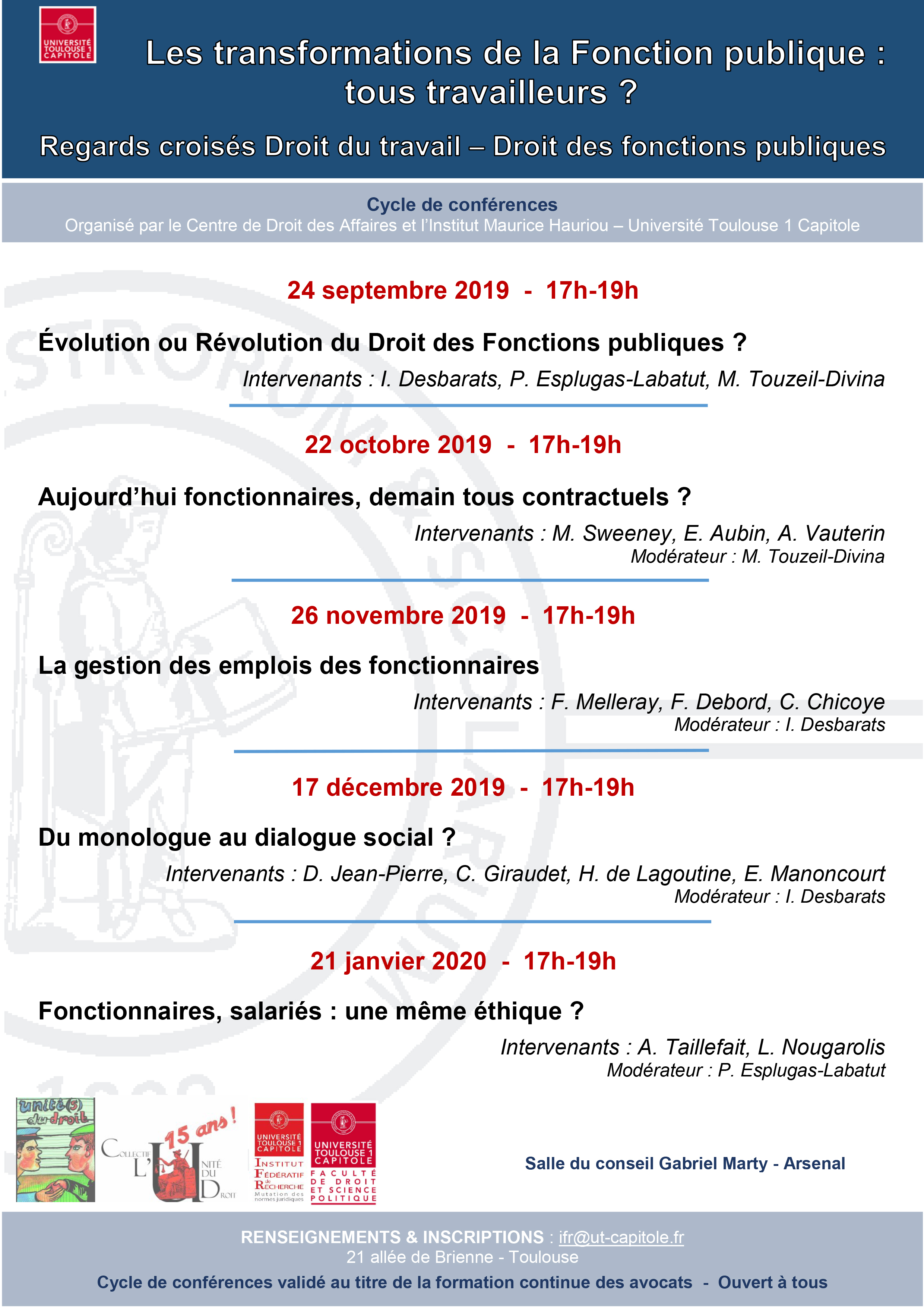 Telles sont quelques-unes des interrogations qui seront évoquées lors des débats organisés entre une spécialiste de droit du travail (Florence Debord, Maître de conférences-HDR, Université Lyon II) et un spécialiste de droit de la fonction publique (Fabrice Melleray, Professeur IEP Paris), en présence d’un grand « témoin-praticien » (Cécile Chicoye, DGS, Université Toulouse-Capitole), et d’Isabelle Desbarats.