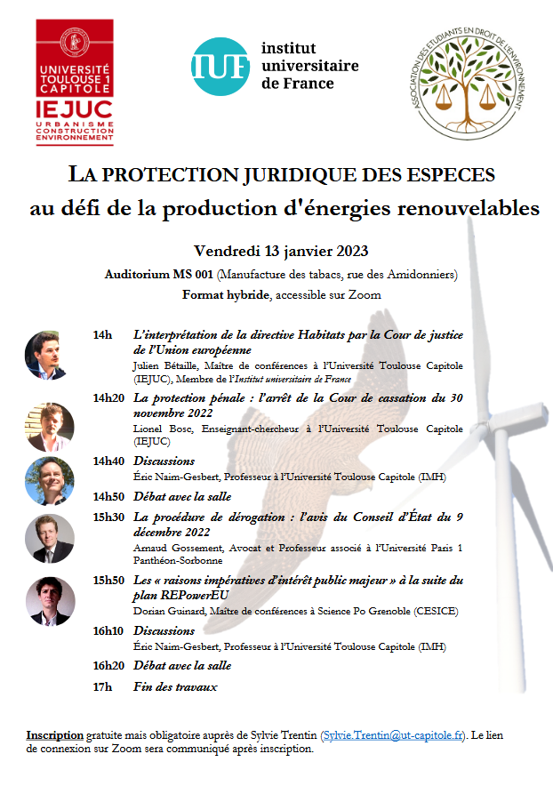 L'IEJUC organise le 13 janvier 2023 une table ronde sur le thème de "La protection juridique des espèces au défi de la production d'énergies renouvelables".