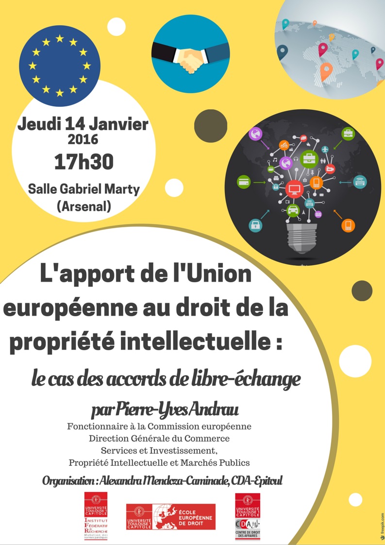 "L'apport de l'Union européenne au droit de la propriété intellectuelle : le cas des accords de libre-échange" par Pierre-Yves Andrau organisé par A. Mendoza-Caminade (CDA-EPITOUL)