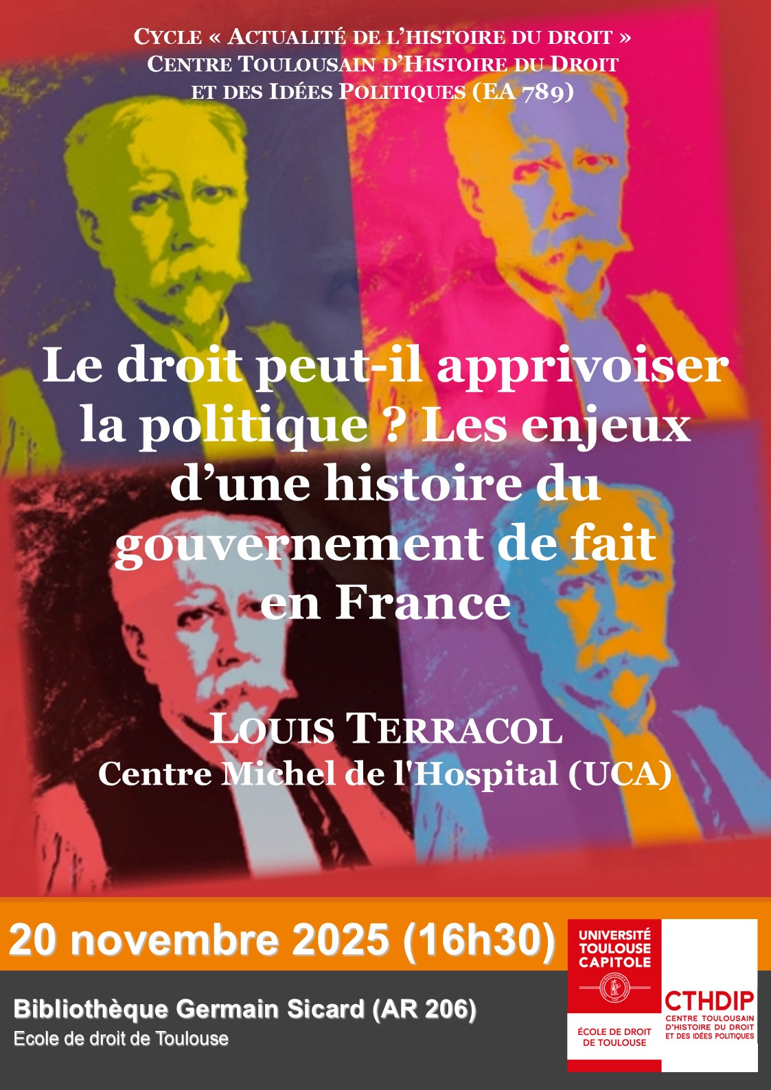 "Le droit peut-il apprivoiser la politique ? Les enjeux d’une histoire du gouvernement de fait en France", conférence de Louis Terracol organisée par Jérôme Henning (CTHDIP)