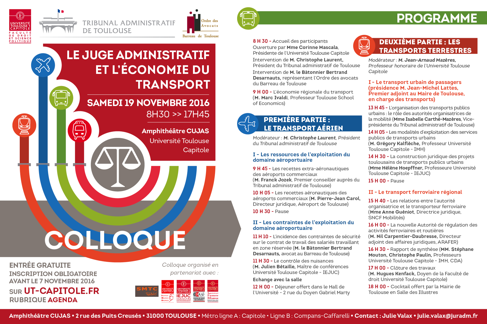 Les interventions de cette journée porteront tant sur l’activité aéroportuaire – y compris la protection que les aéroports doivent accorder aux passagers et aux riverains – que l’organisation et l’exploitation des services publics de transports urbains ou encore les activités ferroviaires, notamment les relations qu’entretiennent l’autorité organisatrice et le transporteur et le rôle de l’autorité de régulation (ARAFER).