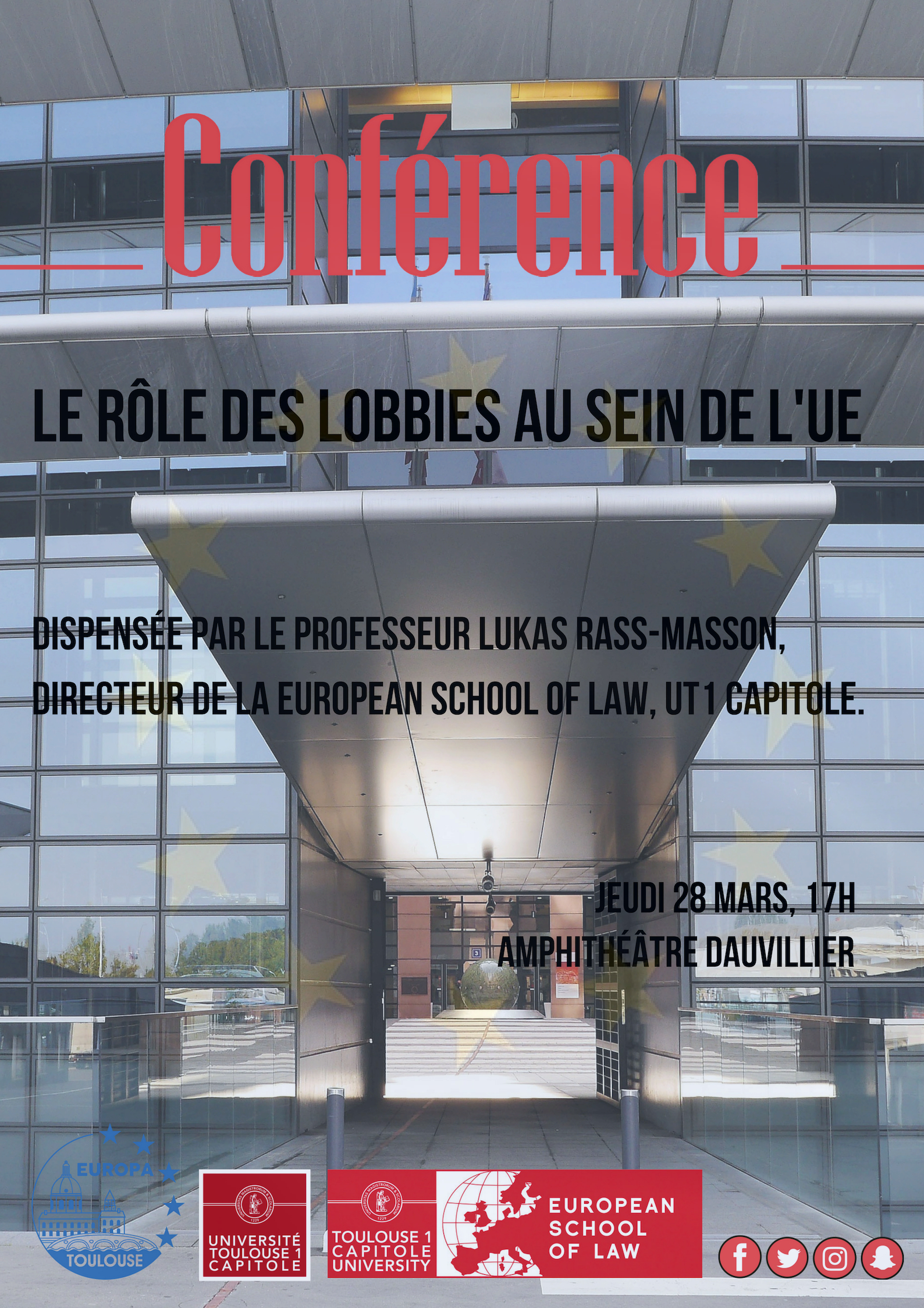 M. Lukas Rass-Masson, directeur de la European School of Law et professeur de droit privé à l'Université Toulouse Capitole, interviendra le jeudi 28 mars à 17 heures à l'amphithéâtre Dauvillier, sur "Le rôle des lobbies au sein de l'UE".