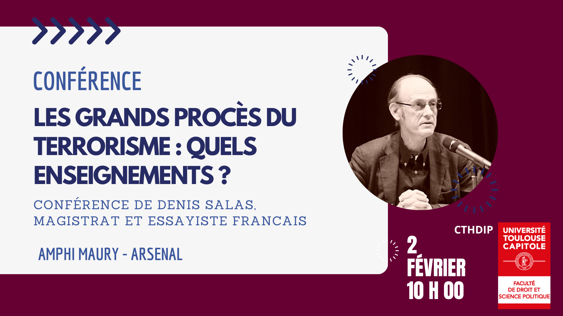 Conférence donnée par Denis Salas et organisée par le Centre Toulousain d'Histoire du Droit et des Idées Politiques (CTHDIP) avec la Faculté de droit et science politique, l'ENM, l'IEJ et le Collège supérieur de droit