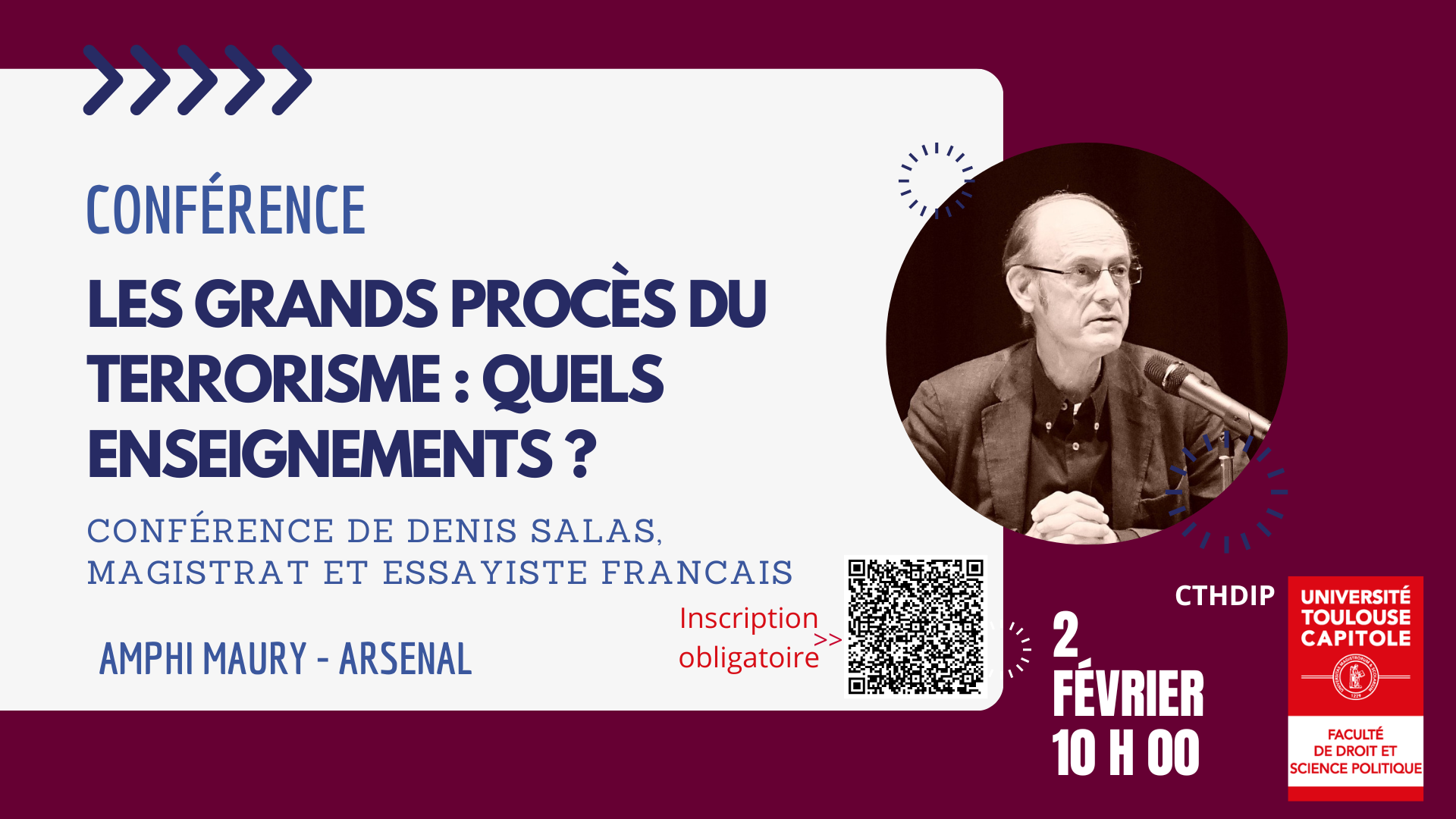 La Faculté de droit de Toulouse a le plaisir d'organiser, en collaboration avec le Centre Toulousain d'Histoire du Droit et des Idées Politiques (CTHDIP), une conférence exceptionnelle donnée par Denis Salas, Magistrat et essayiste français.