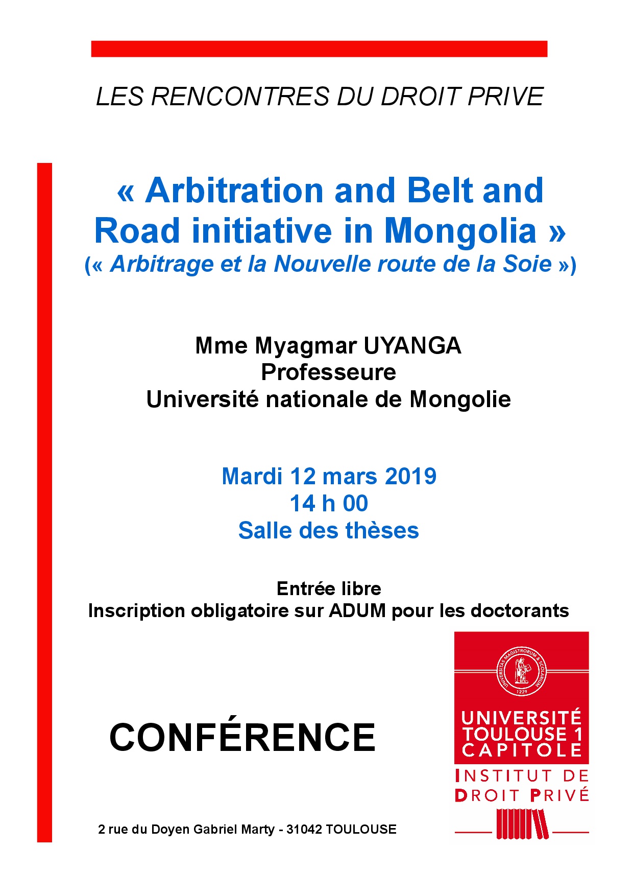 Les rencontres du droit privé «Arbitration and Belt and Road initiative in Mongolia"» conférence de l'IDP par Myagmar UYANGA