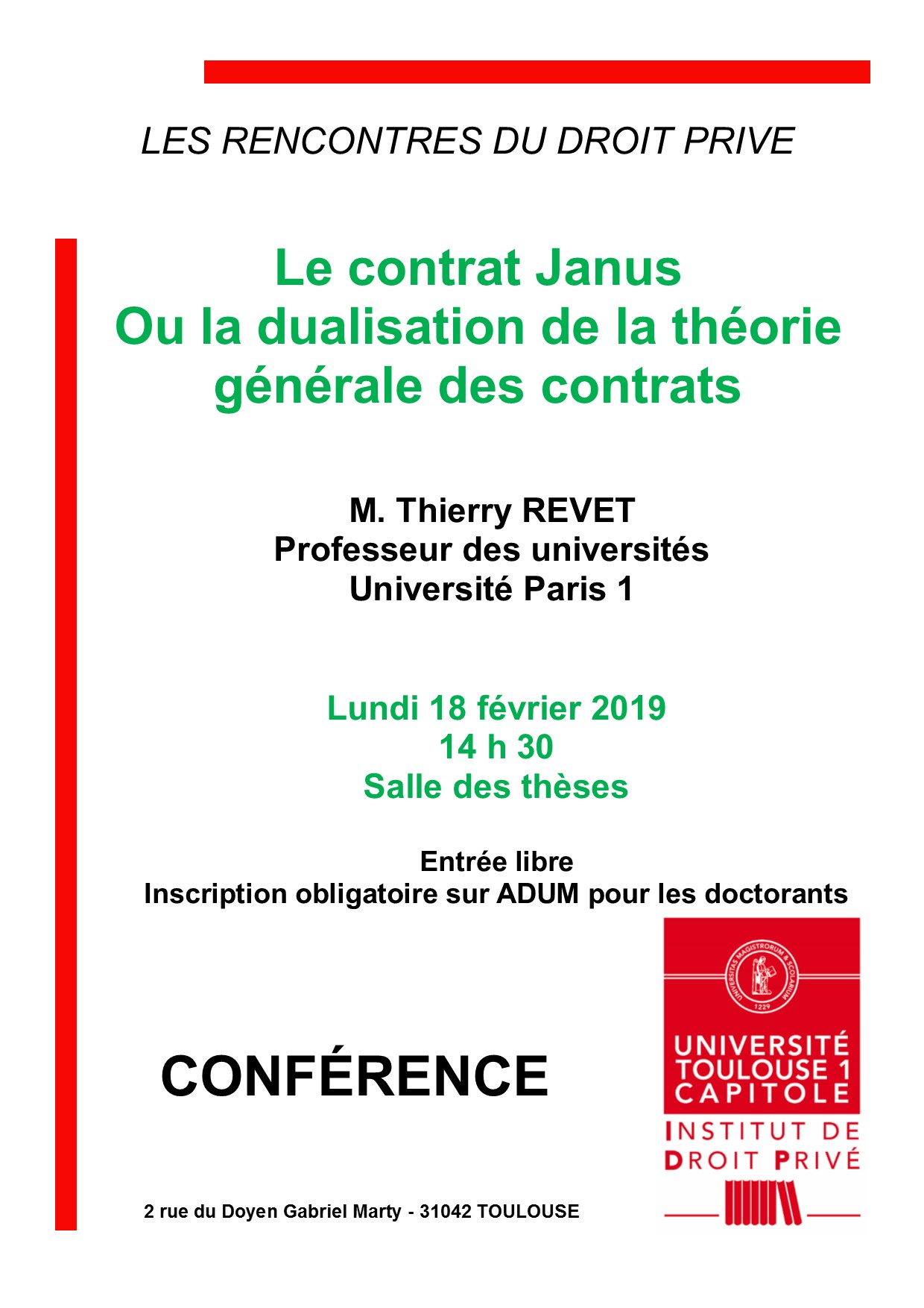 Les rencontres du droit privé «Le contrat Janus ou la dualisation de la théorie générale des contrats» conférence de l'IDP par Thierry REVET