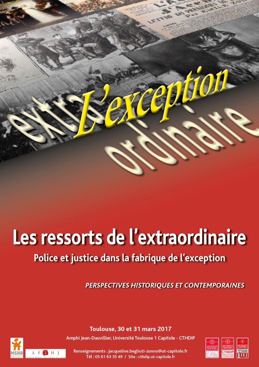 - par voie postale : Université Toulouse 1 Capitole - CTHDIP - Bureau AR 206 - Colloque "Les ressorts de l'extraordinaire" - 2 rue du Doyen Gabriel Marty - 31042 Toulouse cedex 9