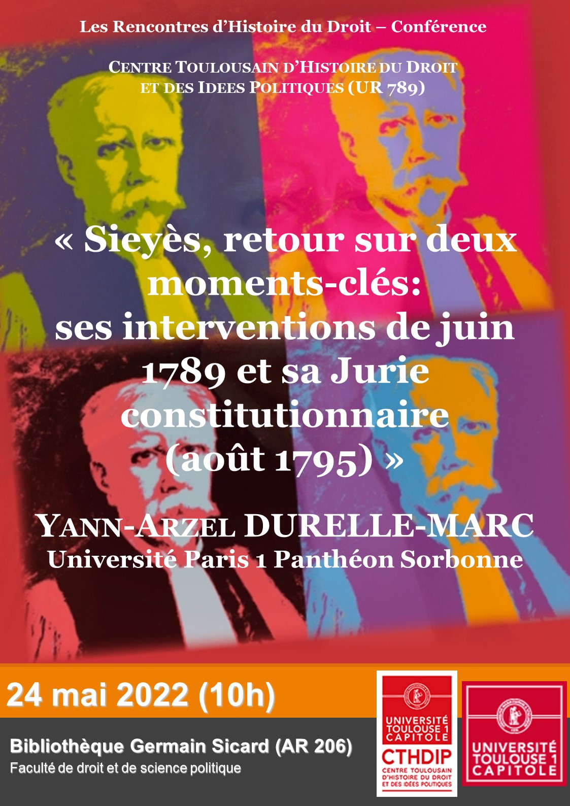 M. Yann-Arzel DURELLE-MARC donnera la conférence : « Sieyès, retour sur deux moments-clés: ses interventions de juin 1789 et sa Jurie constitutionnaire (août 1795) » au CTHDIP le 24 mai 2022. Les inscriptions à la conférence se font auprès de Nathalie Salaün à :