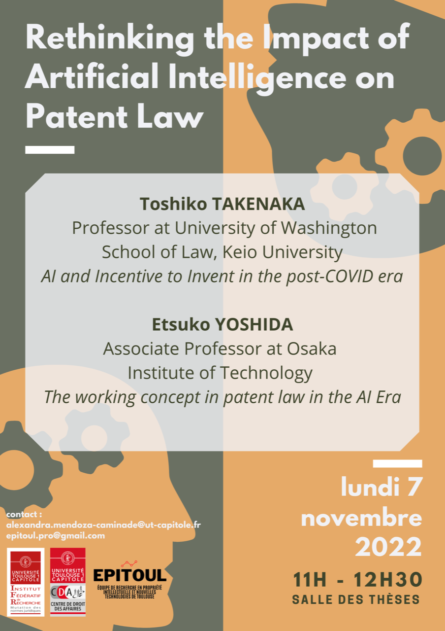 “Rethinking the Impact of Artificial Intelligence on Patent Law” Conférence organisée par A. Mendoza-Caminade, Faculté de Droit et Science Politique, CDA.