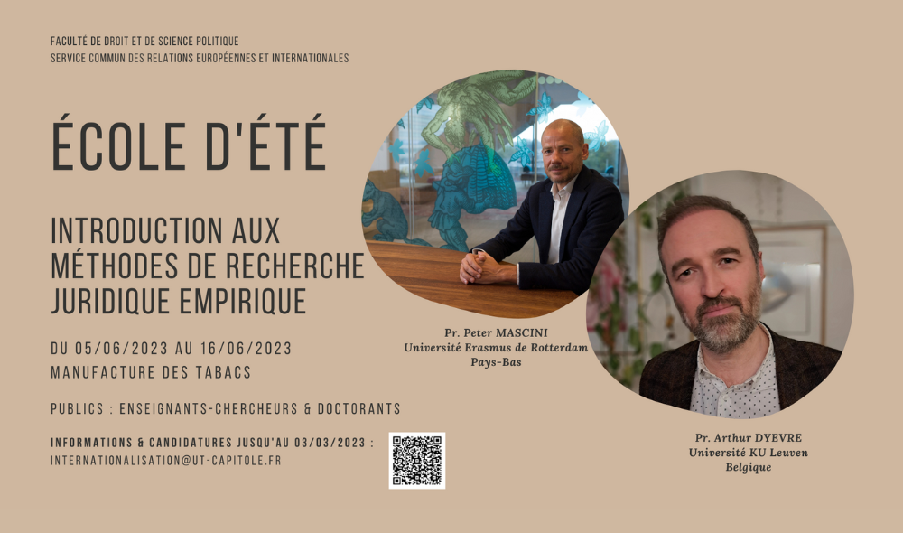 La recherche juridique empirique reste pour l’heure quasiment confidentielle en France. Par exemple, aucun manuel en français n’en présente les méthodes. Pour la première fois, l’Université Toulouse Capitole, son International Research Center for Society et sa faculté de droit et science politique proposent une formation facilement accessible sur les méthodes de la recherche juridique empirique, dispensée par deux enseignants-chercheurs de renommée internationale, Arthur Dyevre (Université KU Leuven, Belgique) et Peter Mascini (Université Erasmus de Rotterdam, Pays-Bas).