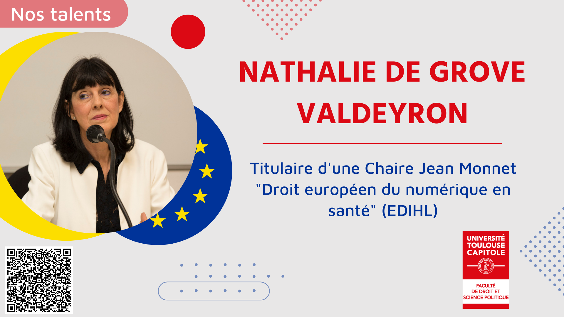 Nathalie De Grove Valdeyron, Professeure de droit public à l'Université Toulouse Capitole, est titulaire d'une Chaire Jean Monnet en Droit européen du numérique en santé (European DIgital Health Law - EDIHL), pour une durée de 3 ans.