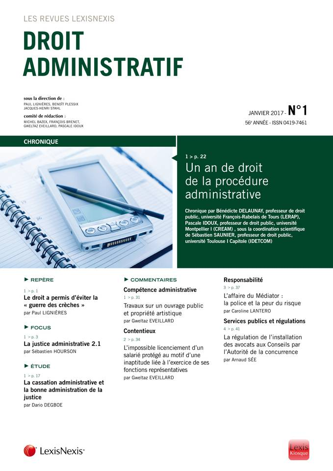 Droit Administratif - Janvier 2017 - n° 1. Chronique par Bénédicte DELAUNAY professeur de droit publicuniversité François-Rabelais de Tours (LERAP) et Pascale IDOUX professeur de droit publicuniversité Montpellier I (CREAM) et Sébastien SAUNIER professeur de droit publicuniversité Toulouse I Capitole (IDETCOM)coordinateur scientifique