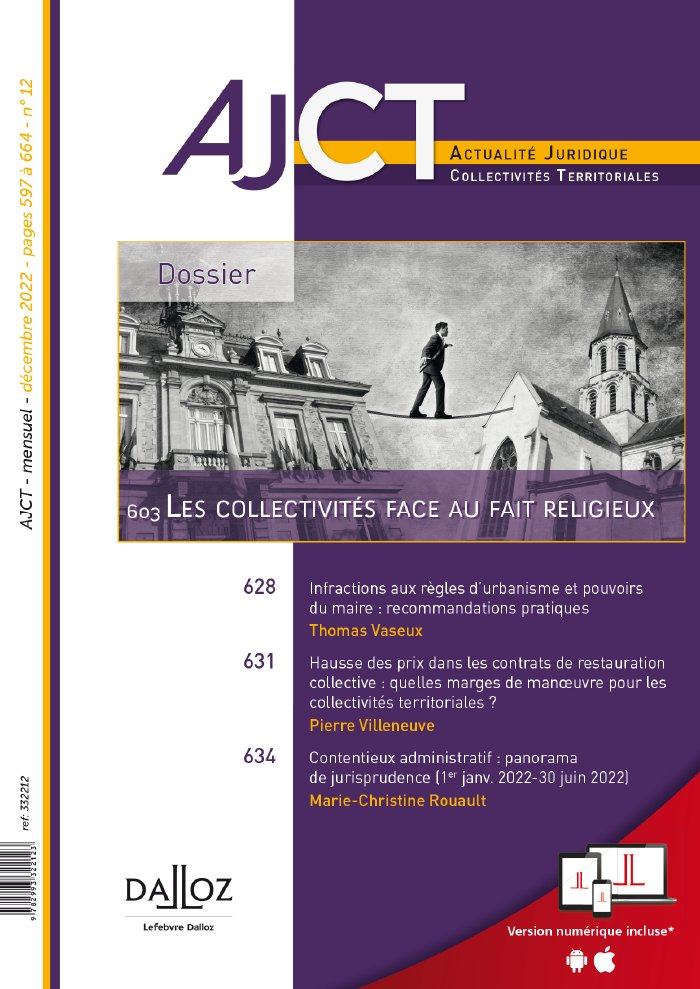 L'AJCT, dans son numéro 12/2022, a publié un dossier intitulé « Les collectivités face au fait religieux ». Article de Jean-Charles Jobart p. 609