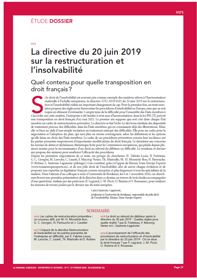Ce dossier présente les travaux d'un groupe de chercheurs sur le contenu de la directive "Restructuration et insolvabilité" et de sa transposition en droit français.