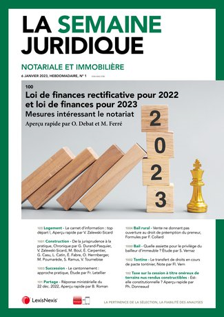 Aperçu rapide par Olivier Debat professeur agrégé à l'université Toulouse Capitole, IDETCOM (EA 785), directeur du M2 Droit fiscal, directeur scientifique de la Revue fiscale du patrimoine et Mathieu Ferré avocat, senior manager - EY Société d'Avocats - chercheur associé à Université Toulouse Capitole, IDETCOM (EA 785). La Semaine Juridique Notariale et Immobilière n° 01, 06 janvier 2023, act. 100.