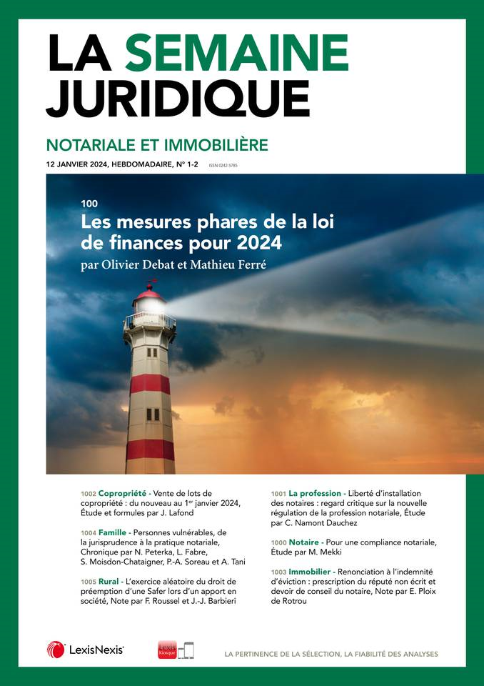 La Semaine Juridique Notariale et Immobilière n° 01-02, 12 janvier 2024, act. 100. Aperçu rapide par Olivier Debat professeur agrégé à l'université Toulouse Capitole, IDETCOM (EA 785), directeur du M2 Droit fiscal, directeur scientifique de la Revue fiscale du patrimoine et Mathieu Ferré avocat, senior manager - EY Société d'Avocats, chercheur associé, IDETCOM (EA 785)
