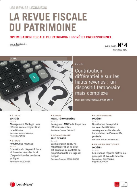 La revue fiscale du patrimoine n° 4, Avril 2025. Édito par Olivier DEBAT professeur agrégé à l’université Toulouse Capitole - directeur du M2 Droit fiscal de l’entreprise - directeur scientifique de la Revue fiscale du Patrimoine et Claire RICHERT rédactrice en chef de la Revue fiscale du patrimoine.