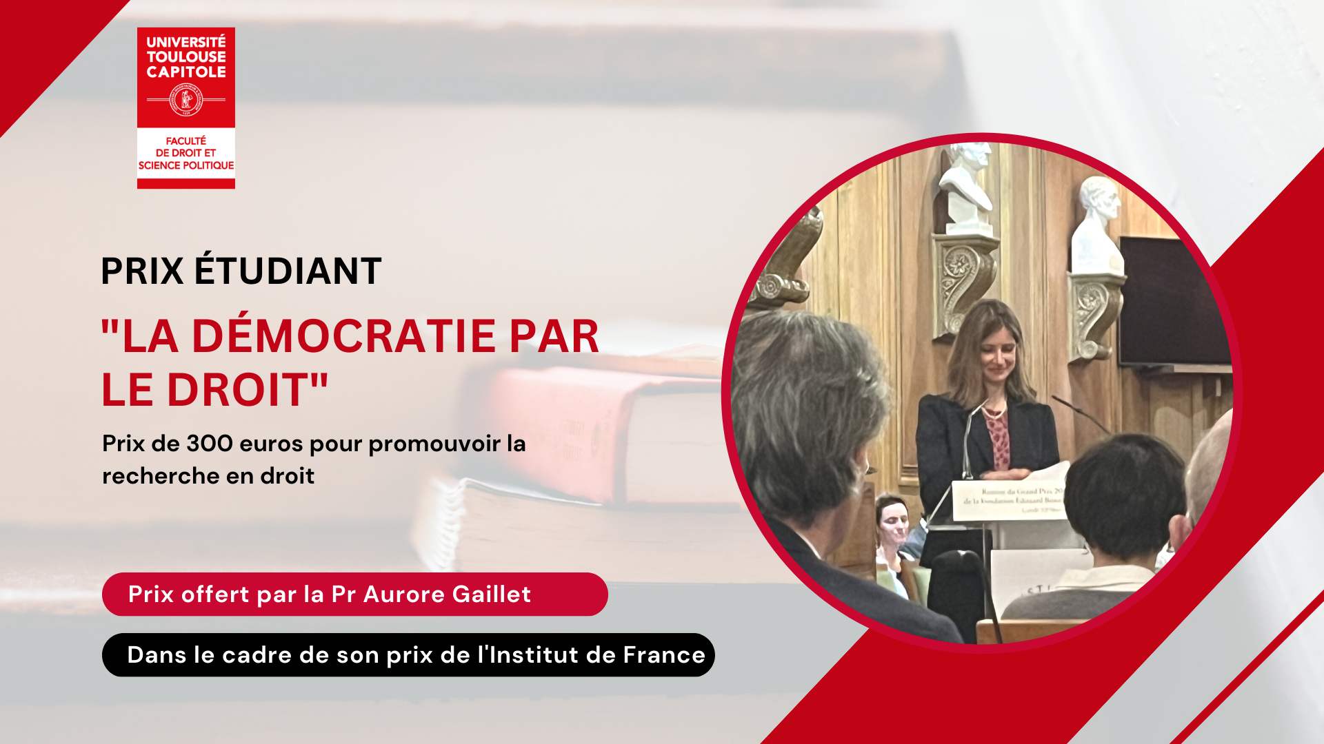 Madame Aurore Gaillet, Professeure à la Faculté de Droit de Toulouse, offre un prix de 300 euros dans le cadre de son prestigieux prix de la Fondation Edouard Bonnefous - Institut de France pour son ouvrage "La Cour constitutionnelle fédérale allemande. Reconstruire une démocratie par le droit (1945-1961)", dans le but de promouvoir la jeune recherche toulousaine en droit.