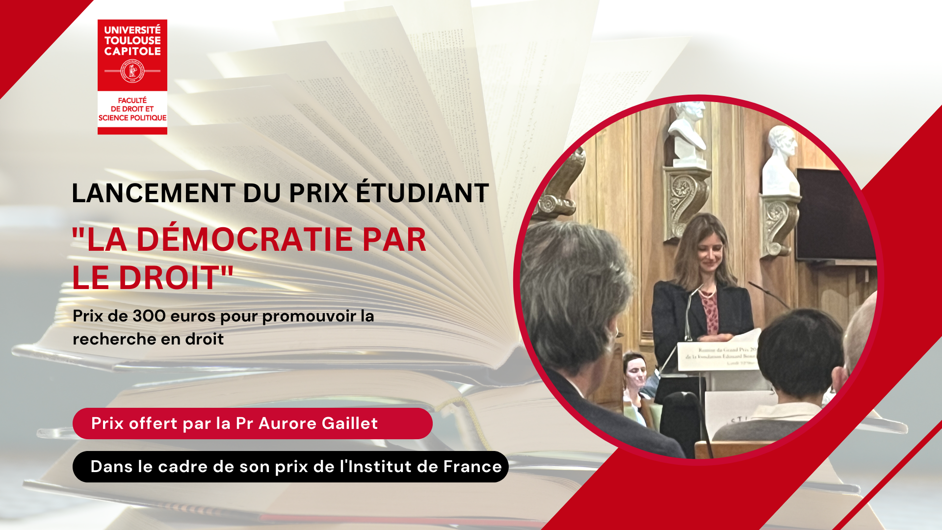 En mars dernier, Madame Aurore Gaillet, Professeure de droit public à la Faculté de Droit de Toulouse, a lancé un appel à candidatures pour la première édition de son prix étudiant, "La Démocratie par le Droit". Les quatre groupes sélectionnés présenteront le fruit de leurs recherches au cours d'une soutenance publique en mars 2024.