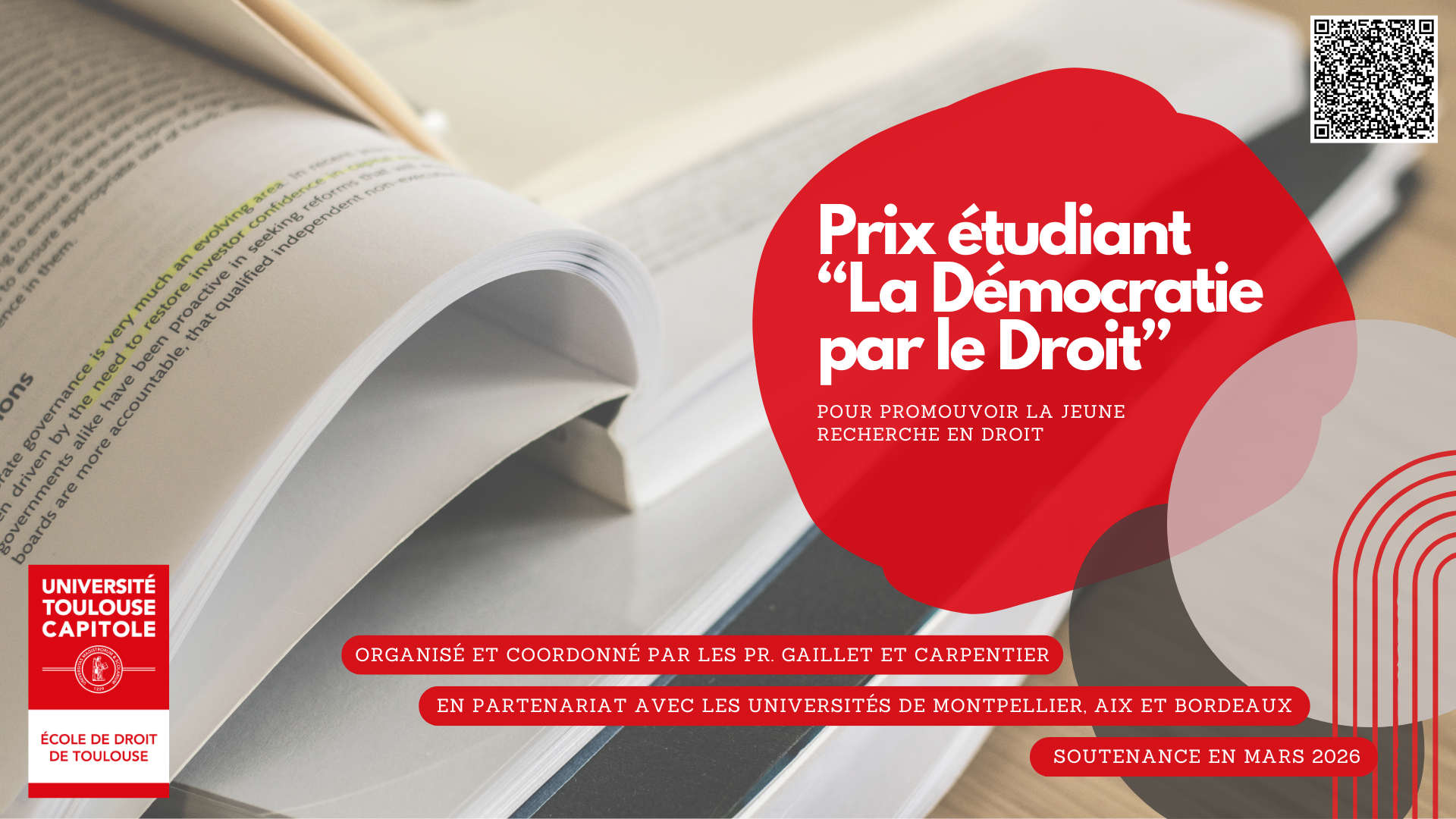 En février dernier, Madame Aurore Gaillet, Professeure de droit public à l'Ecole de droit de Toulouse, a lancé un appel à candidatures pour la troisième édition de son prix étudiant "La Démocratie par le Droit". Les groupes sélectionnés présenteront le fruit de leurs recherches au cours d'une soutenance publique au printemps 2026.